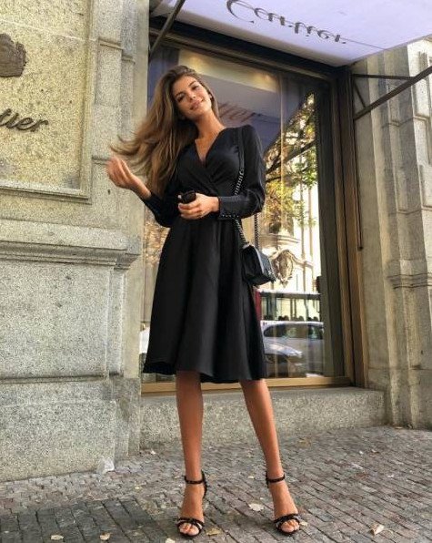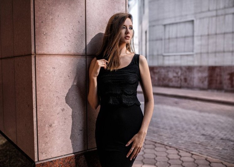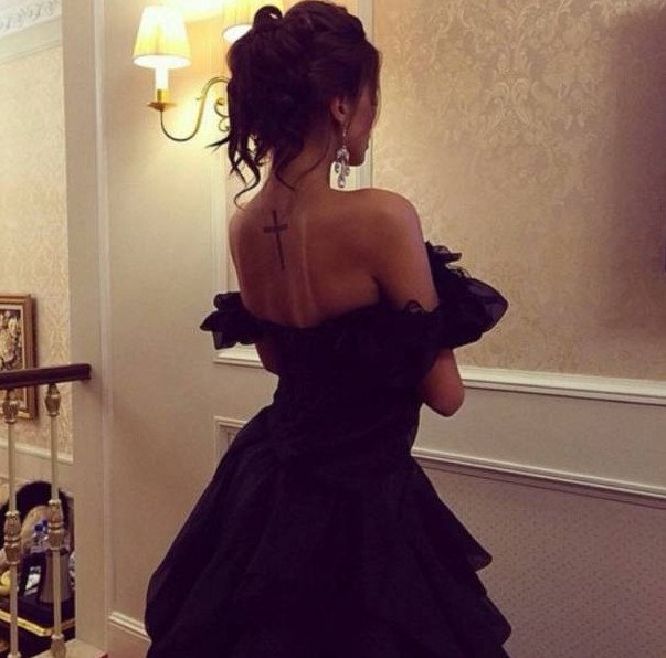 Эротика с брюнеткой в черном прекрасное платье с открытой спиной.