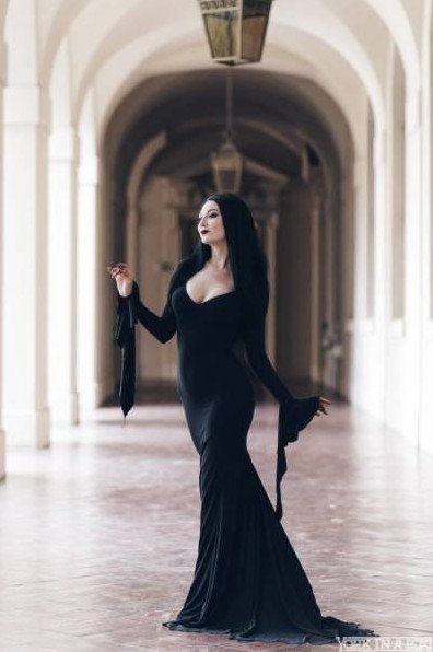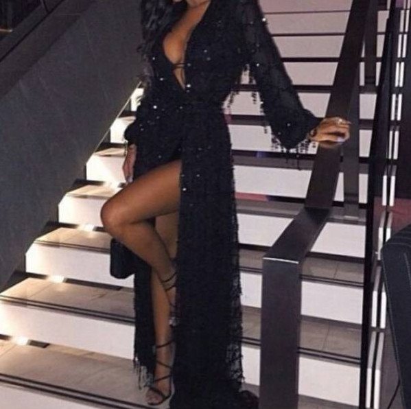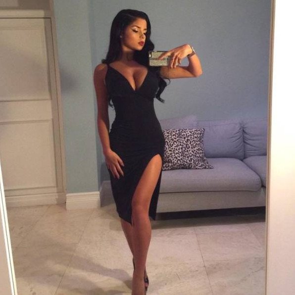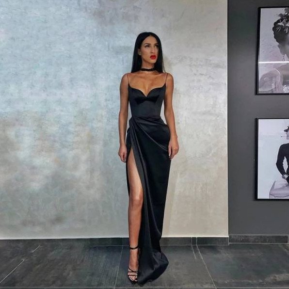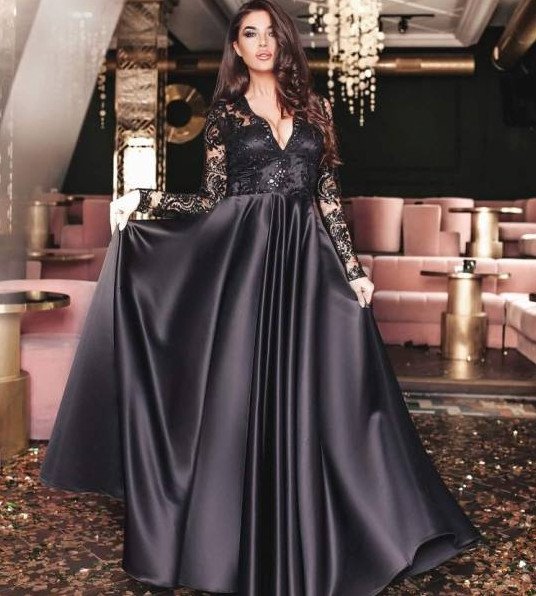 Эротика с брюнеткой в черном Вечернем прекрасное платье.