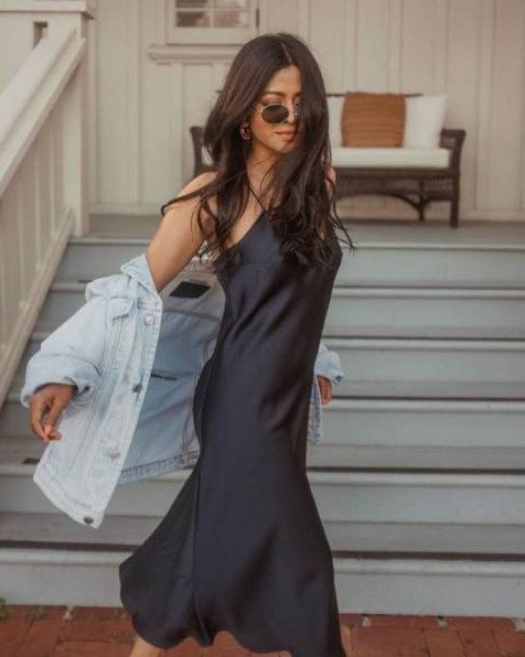 Черное шелковое прекрасное платье на бретельках с разрезом.