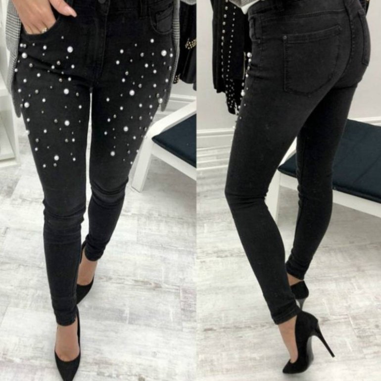 Темные джинсы с бусинами.