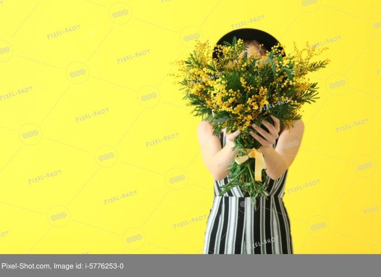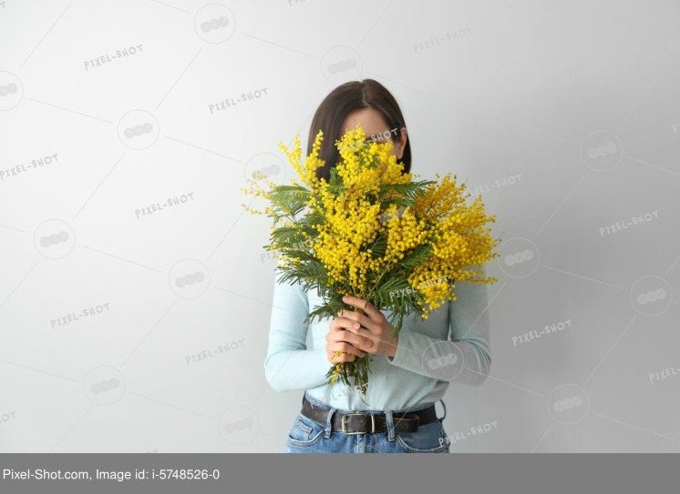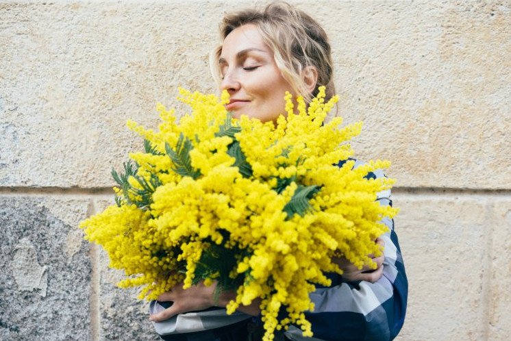 Девушка с букетом мимозы.
