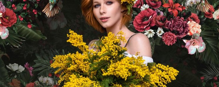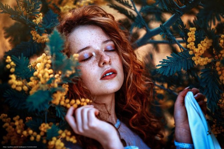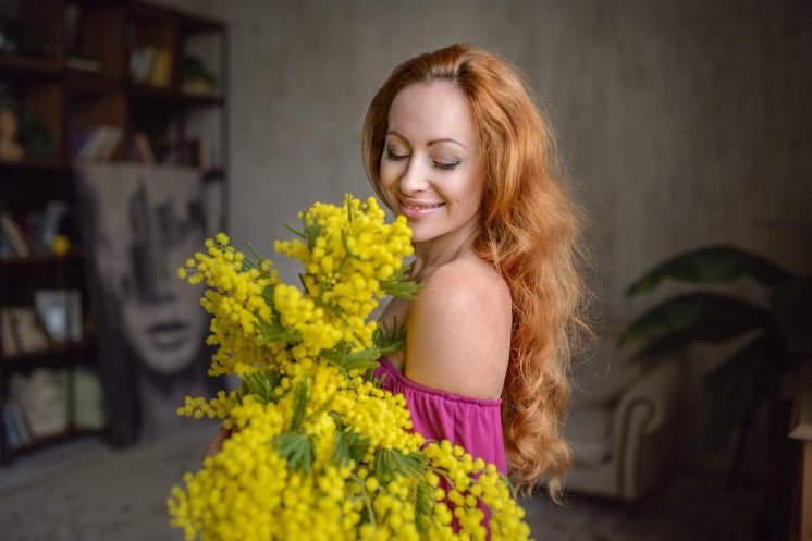 Рыжеватая девушка с мимозами.