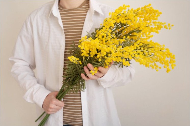 Девушка держит букет мимозу.