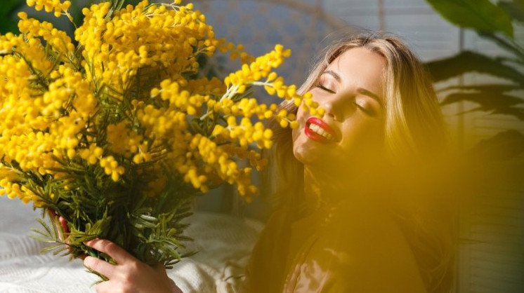 Прелестная прекрасная женщина с мимозой.