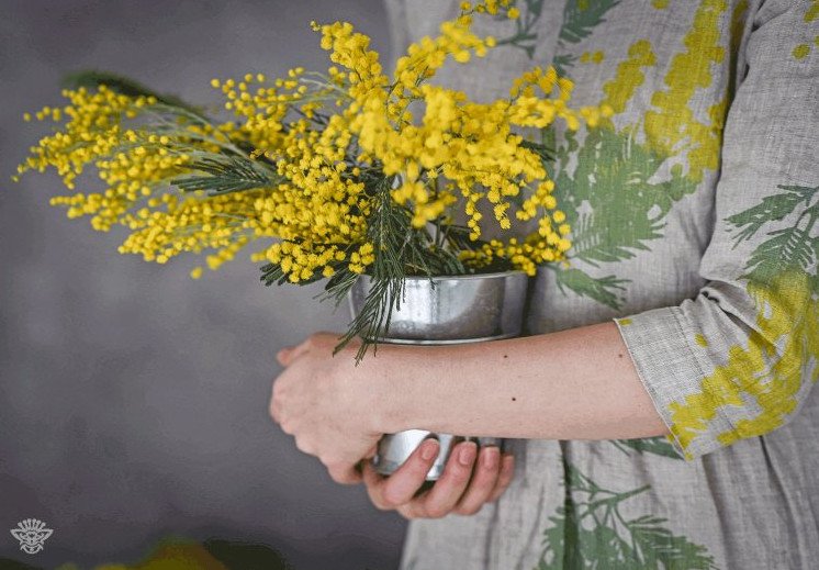 Девушка с букетом мимозы и растений.