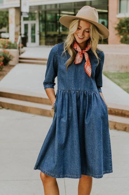 Джинсовое платье с пышноватой юбкой.