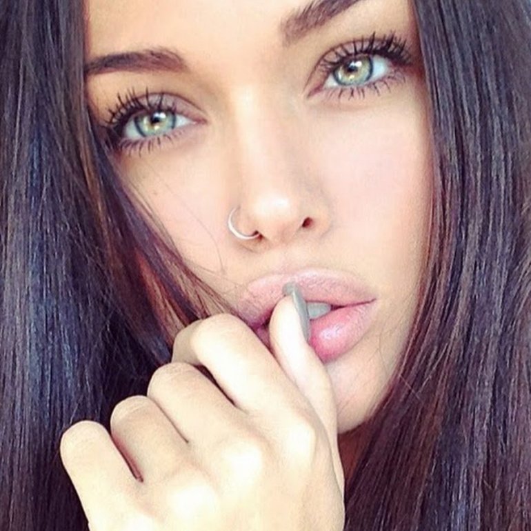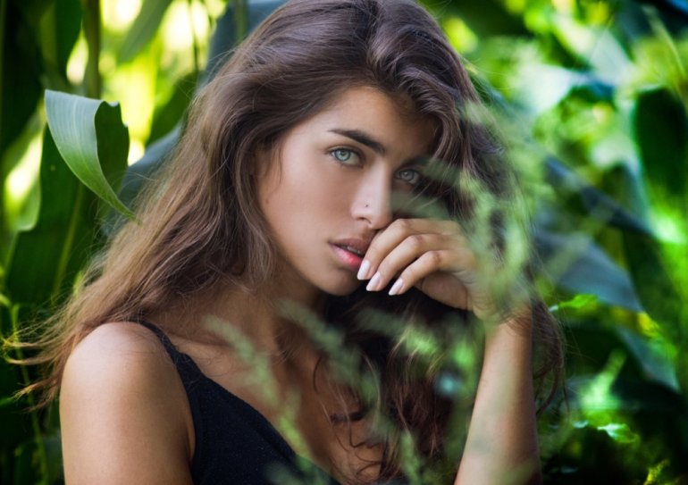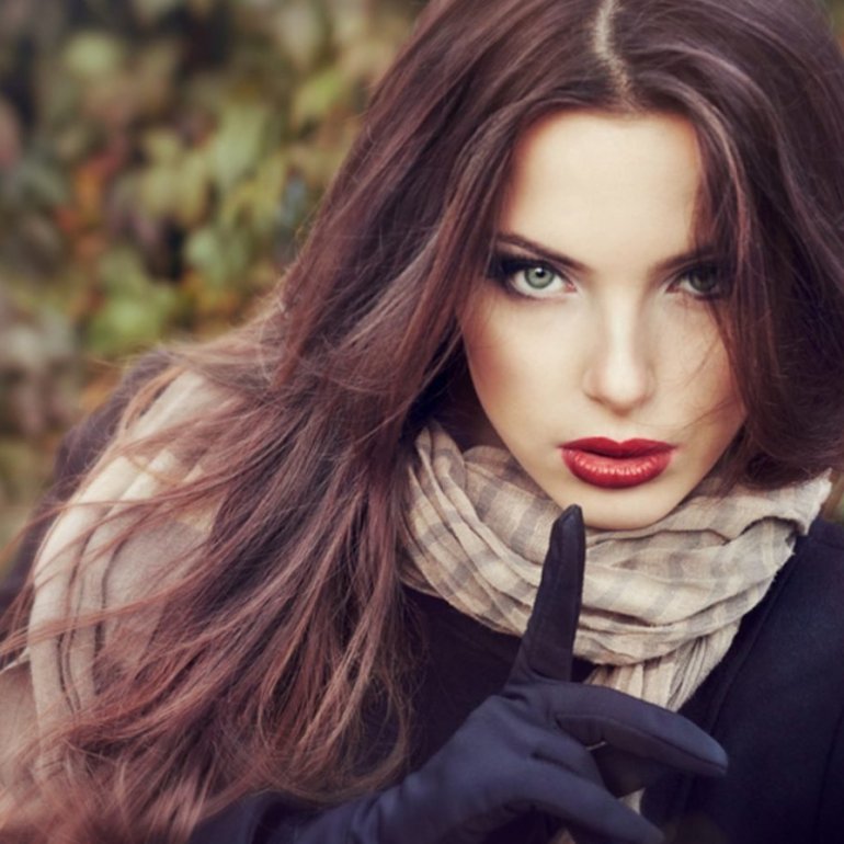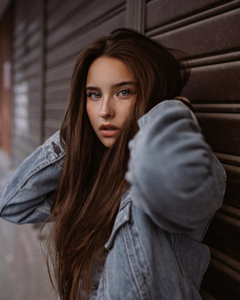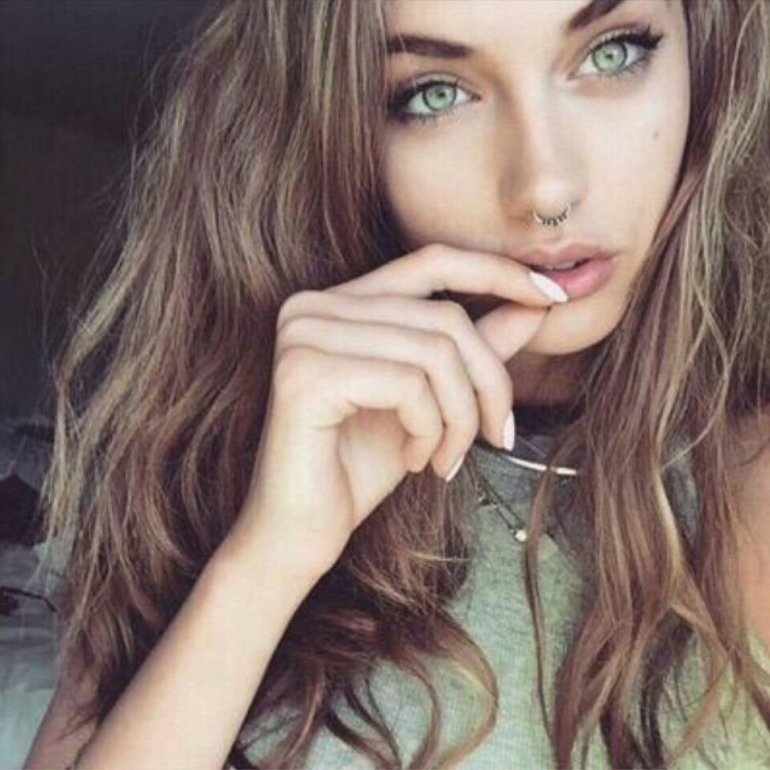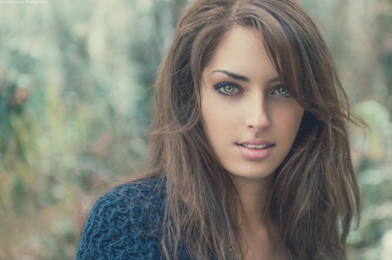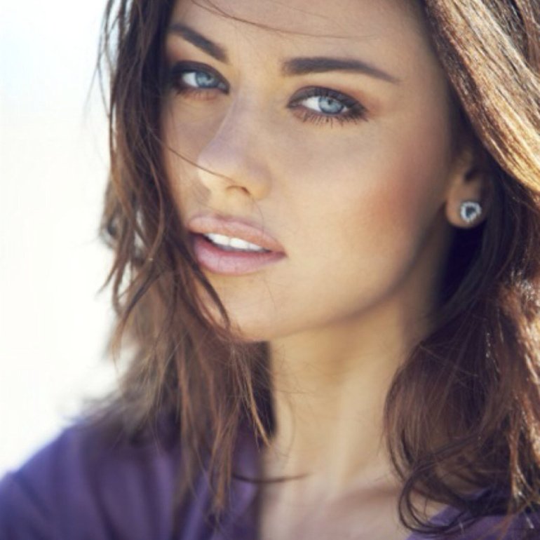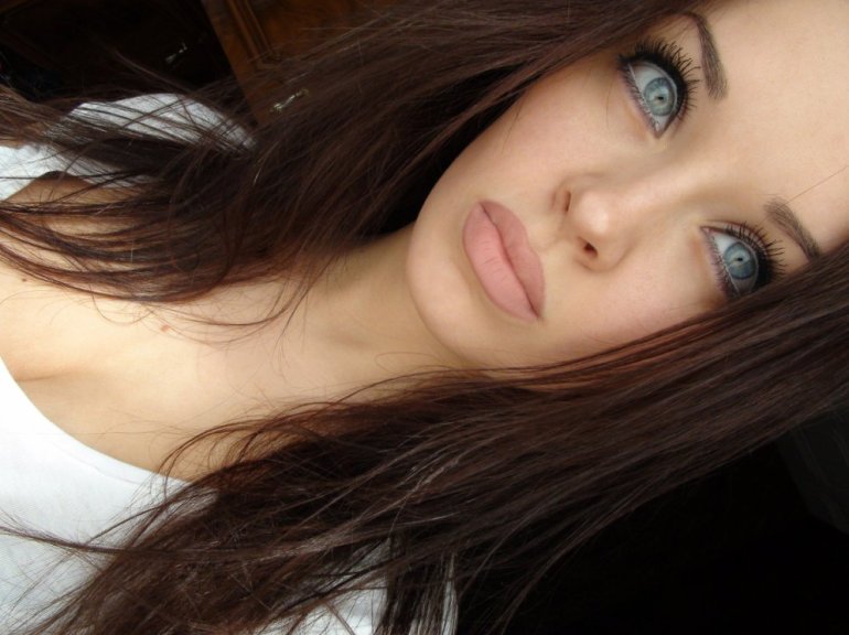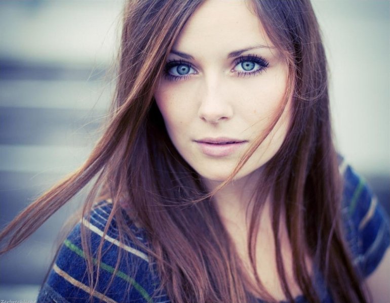 Девушка красавица с каштановыми волосами и голубыми очами.