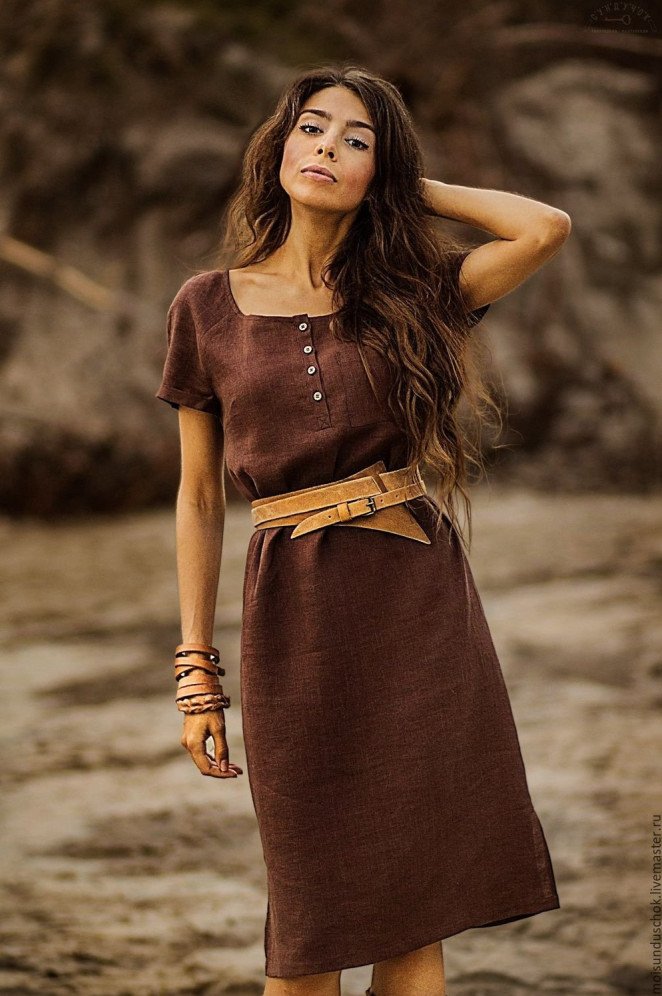 Коричневое льняное платье.