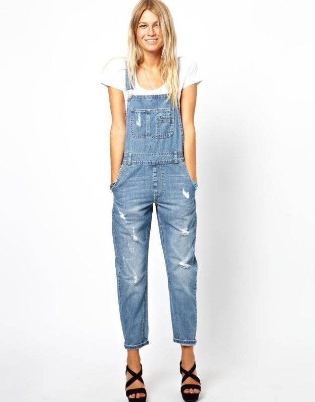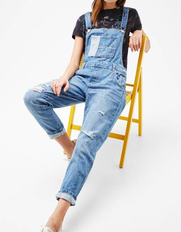 Джинсовый комбинезон с потертостями.
