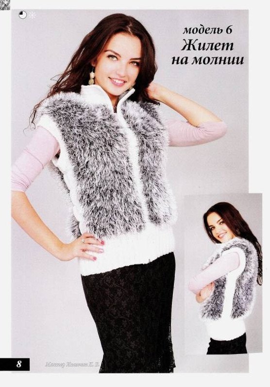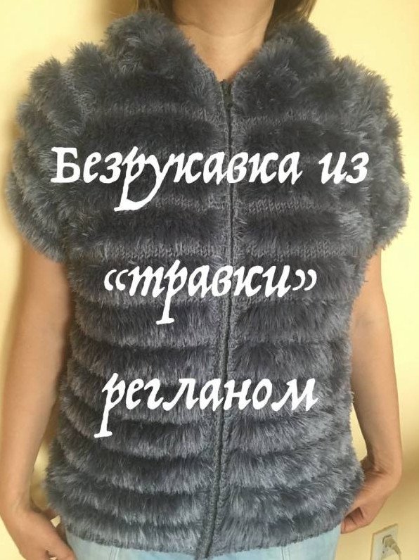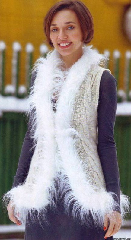 Жилет из меховой пряжи спицами.