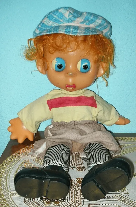 Плоская пластмассовая шарнирная игрушка Пиноккио. Было несколько их заглавий: Незнайка, Чиполлино, Девченка и Буратино. Любопытно, что на всех игрушках не было никакой одежды, не считая обуви и шапок.