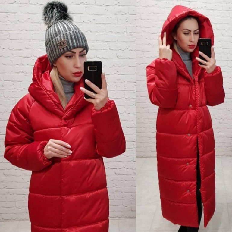 Пуховик зимний длиннющий очень красный.