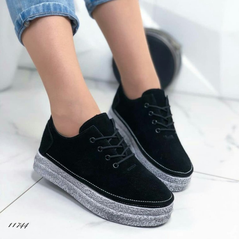 Мрачно сероватые кеды дамские замшевые на темной подошве.