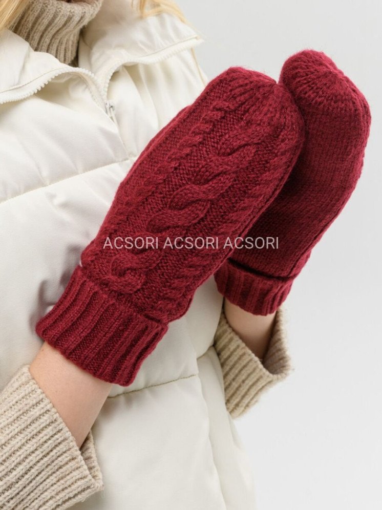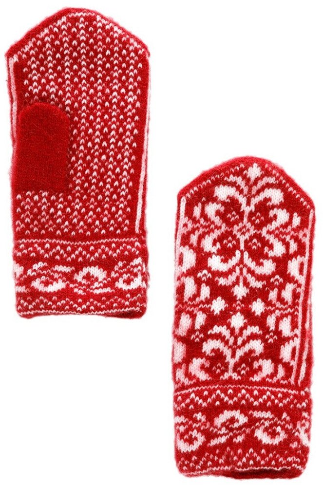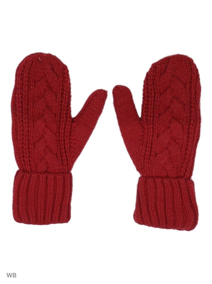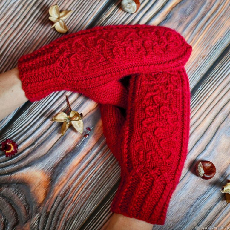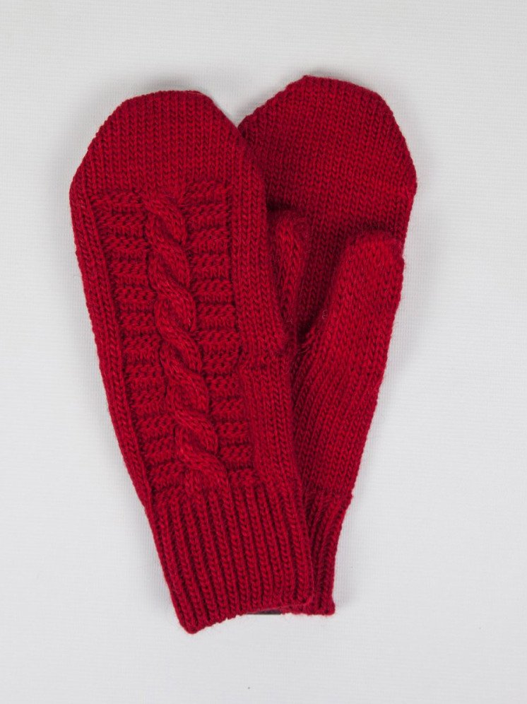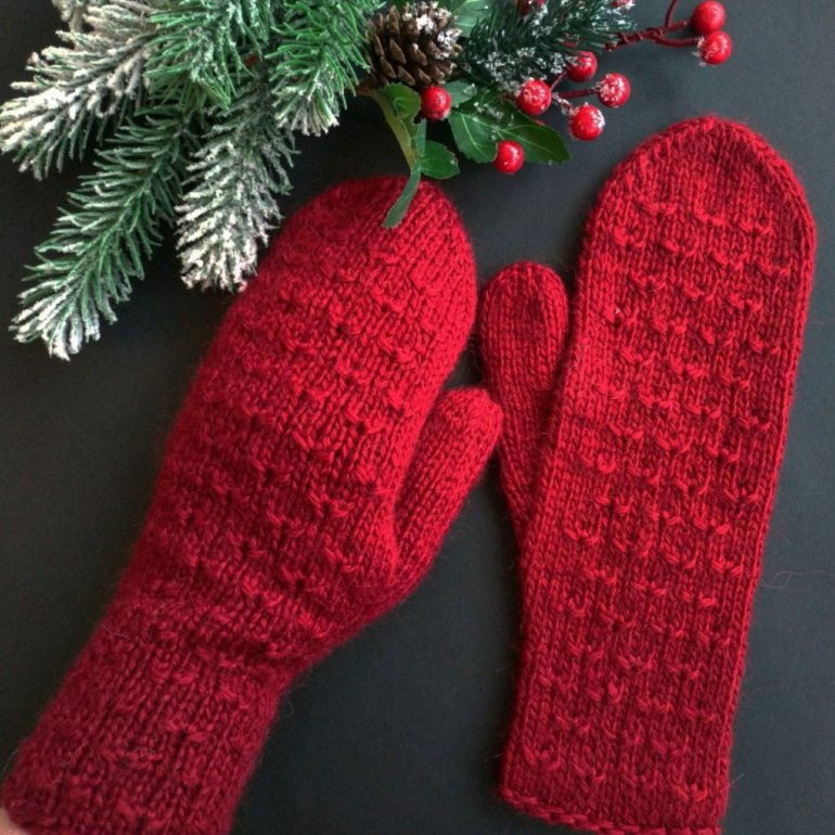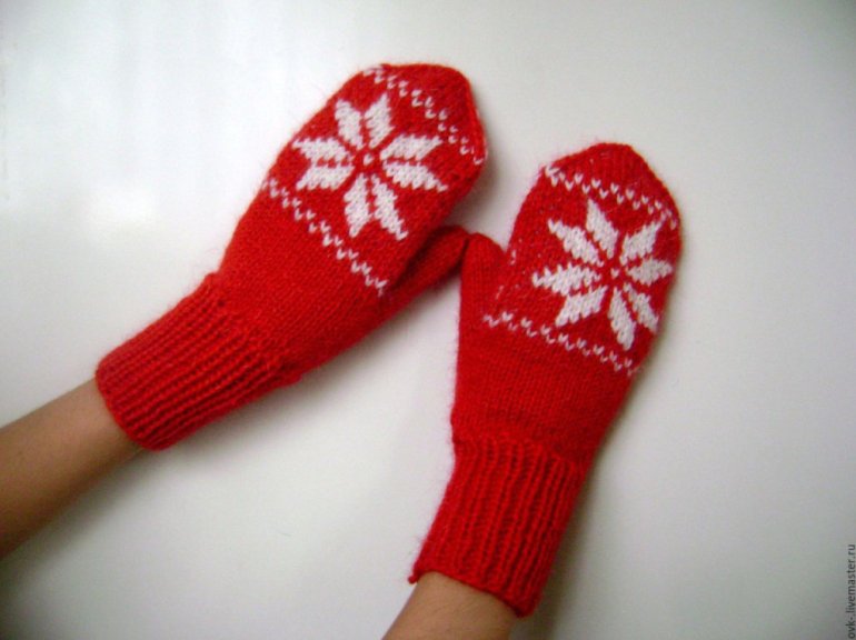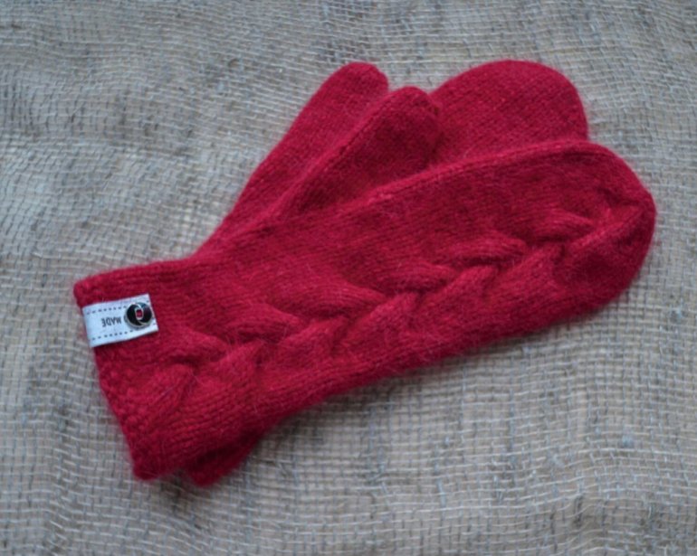 Очень красные вязаные варежки.