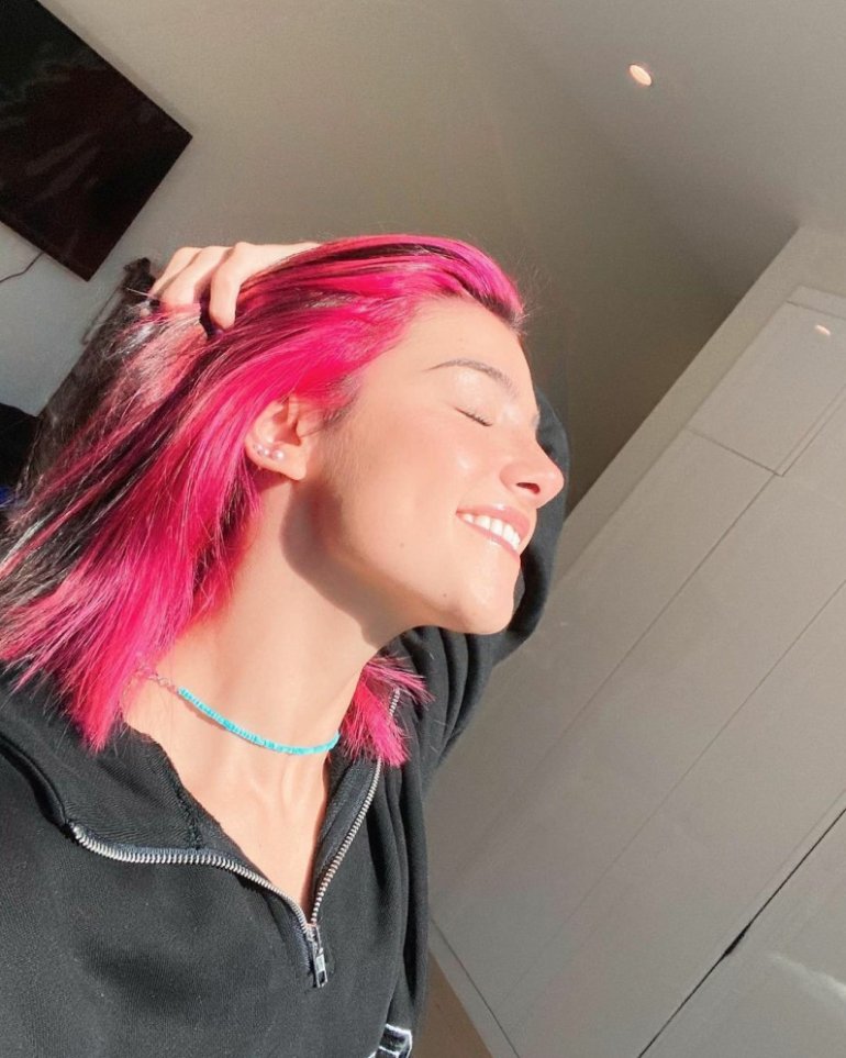 Розовые волосы с голубыми прядями.