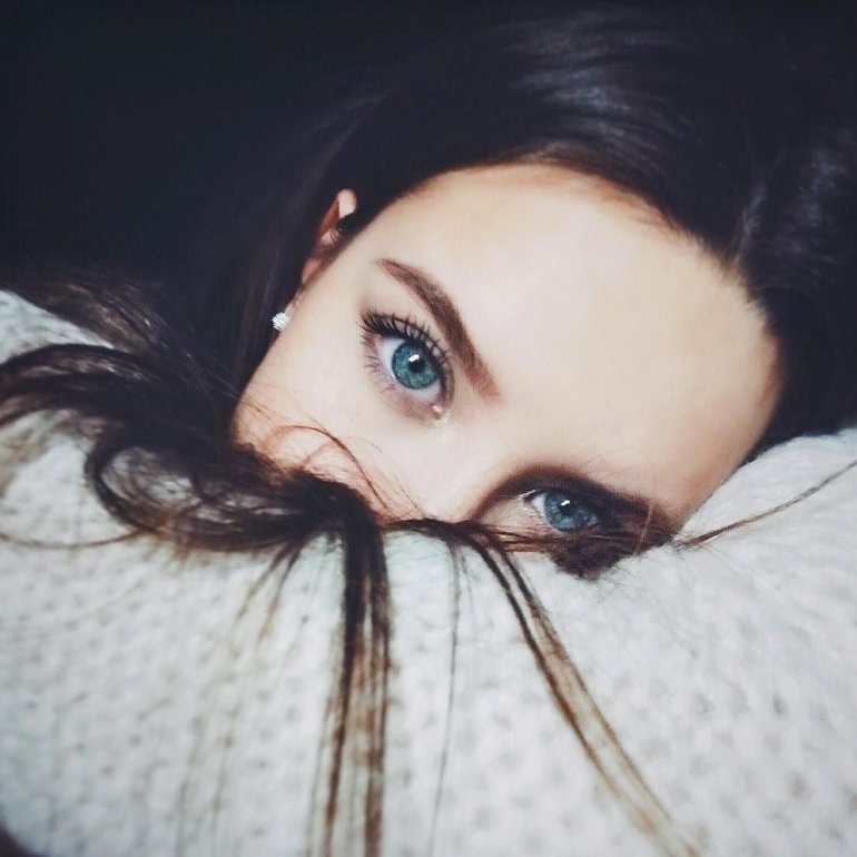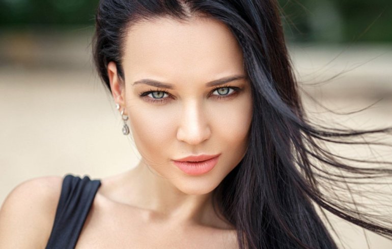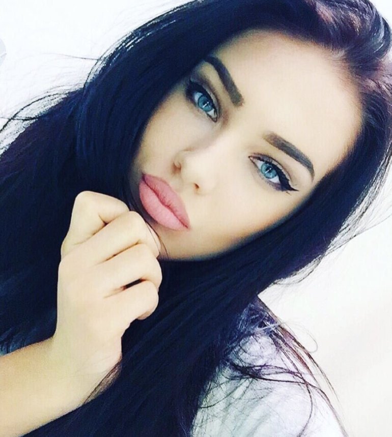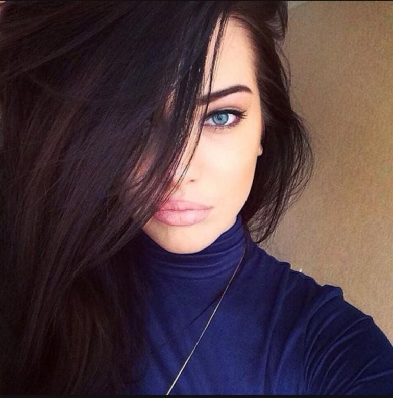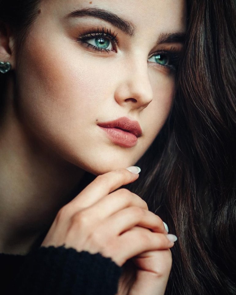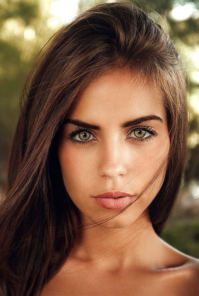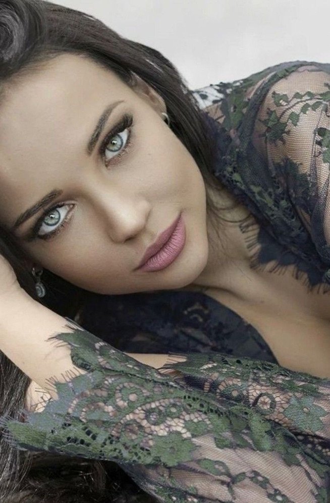 Девушка красавица с каштановыми волосами и голубыми очами.