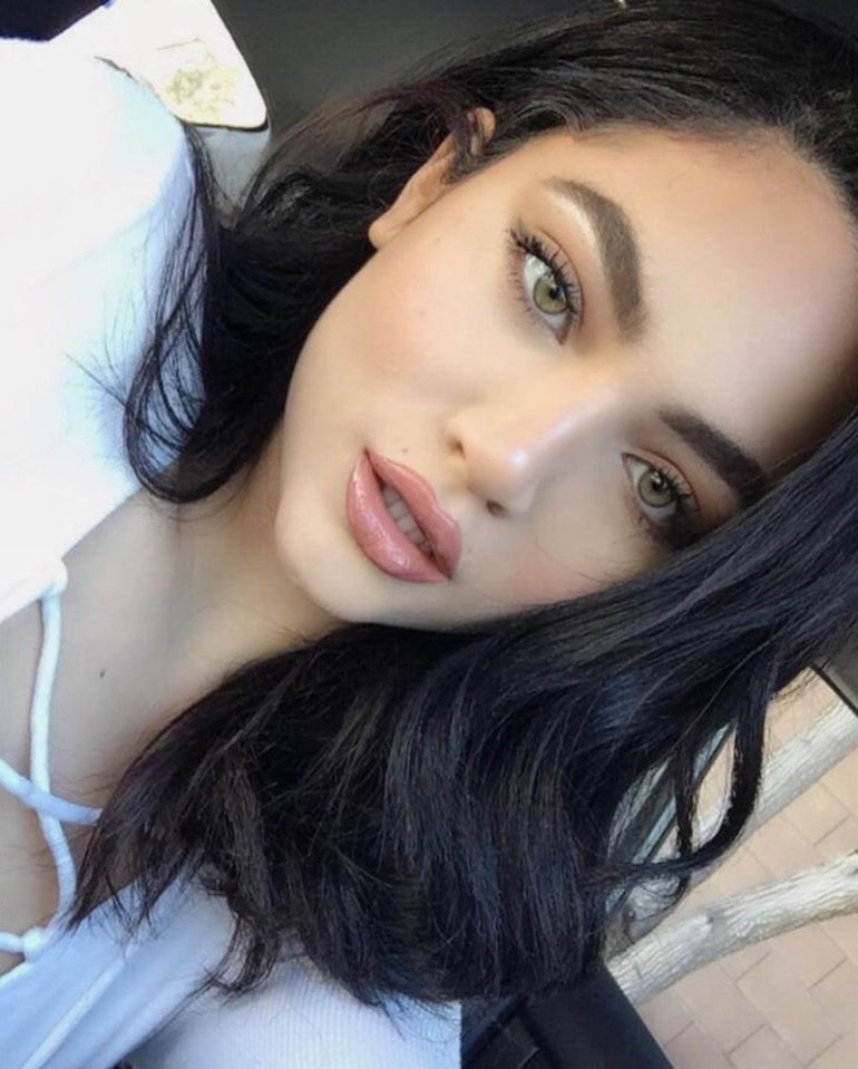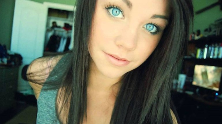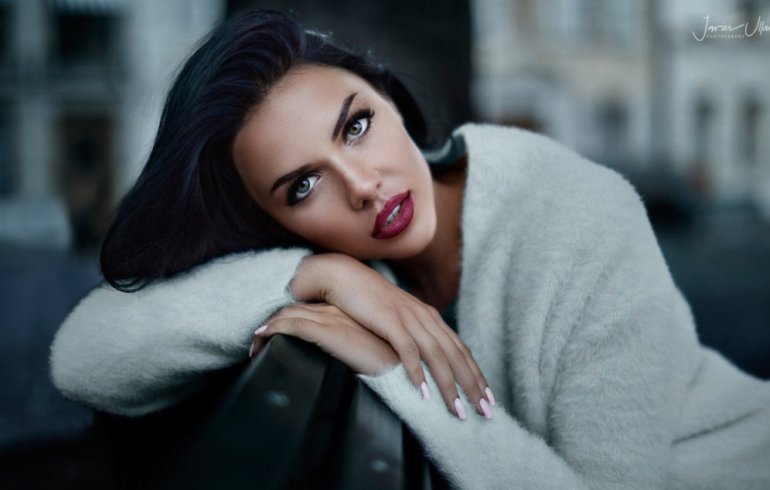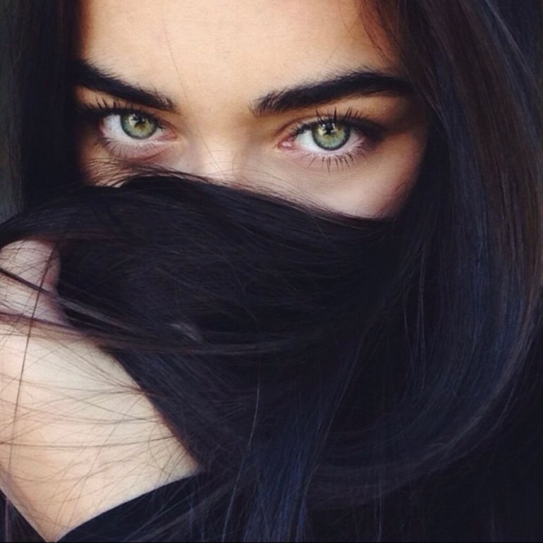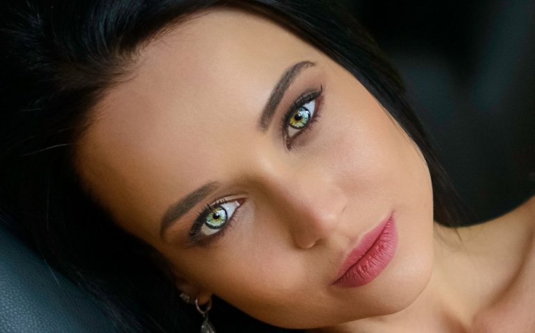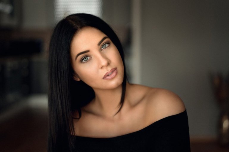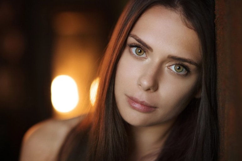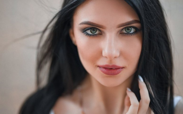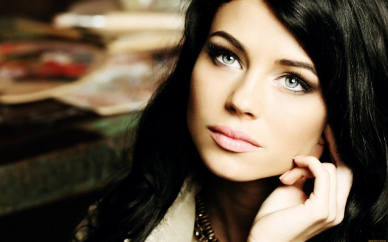 Девушка красавица с каштановыми волосами и голубыми очами.