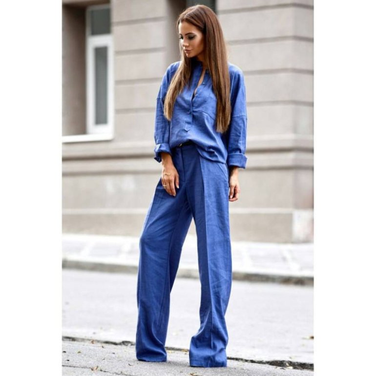 Голубий костюмчик с широкими брюками.