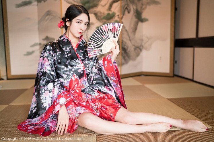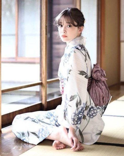 Девушка в кимоно посиживает.