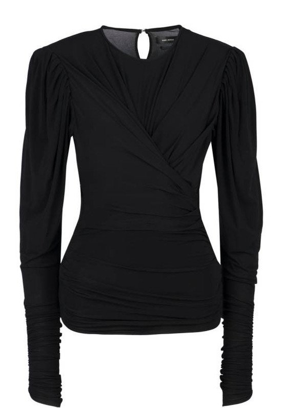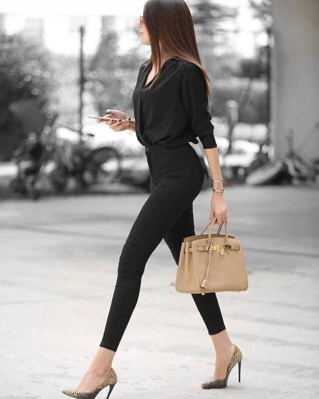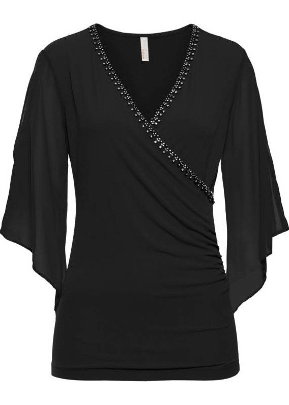 Темная блузка с v образным вырезом.