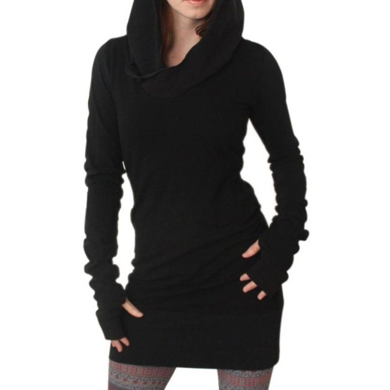 Темная кофта с длинноватыми рукавами.