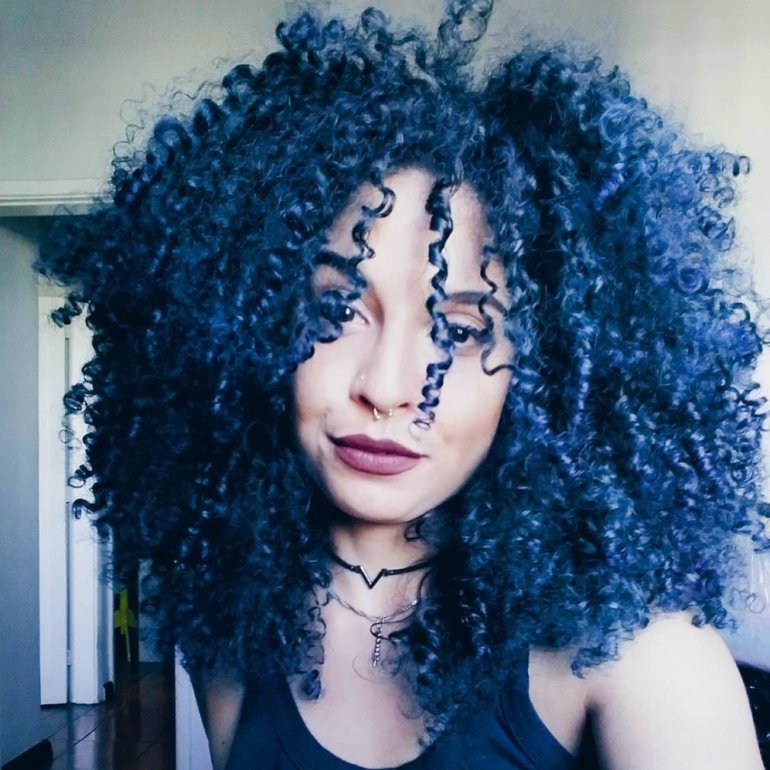 Голубые кучерявые волосы.