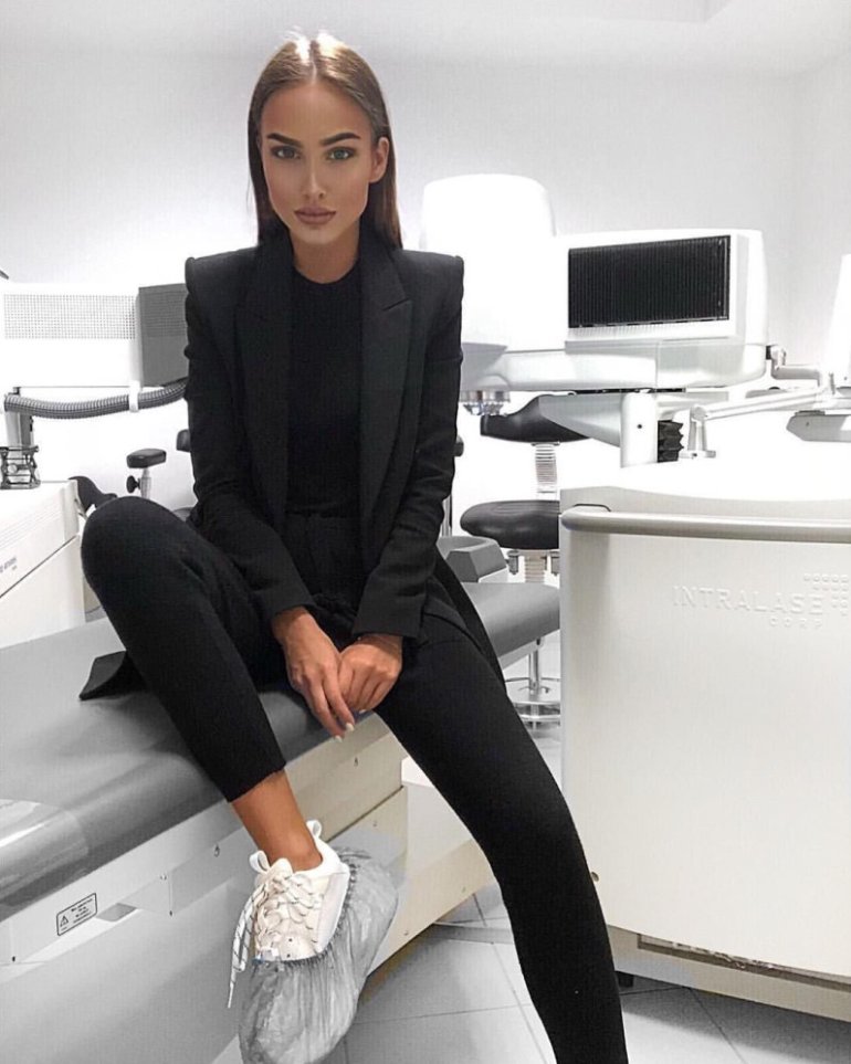 Екатерина Климова в черном брючном костюмчике.