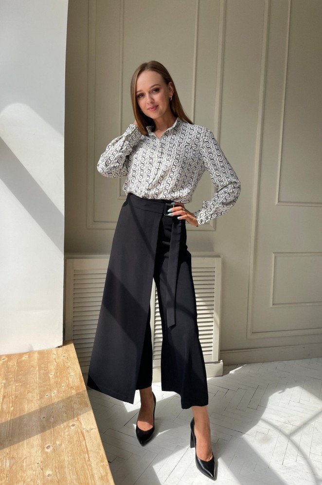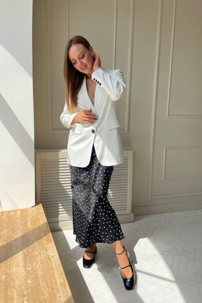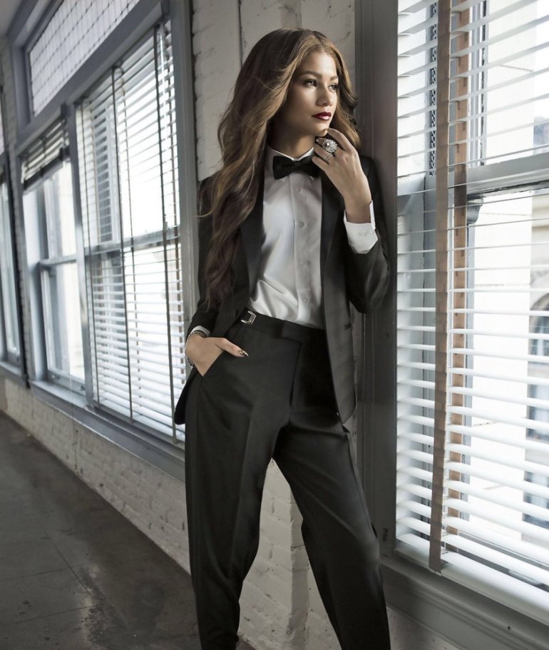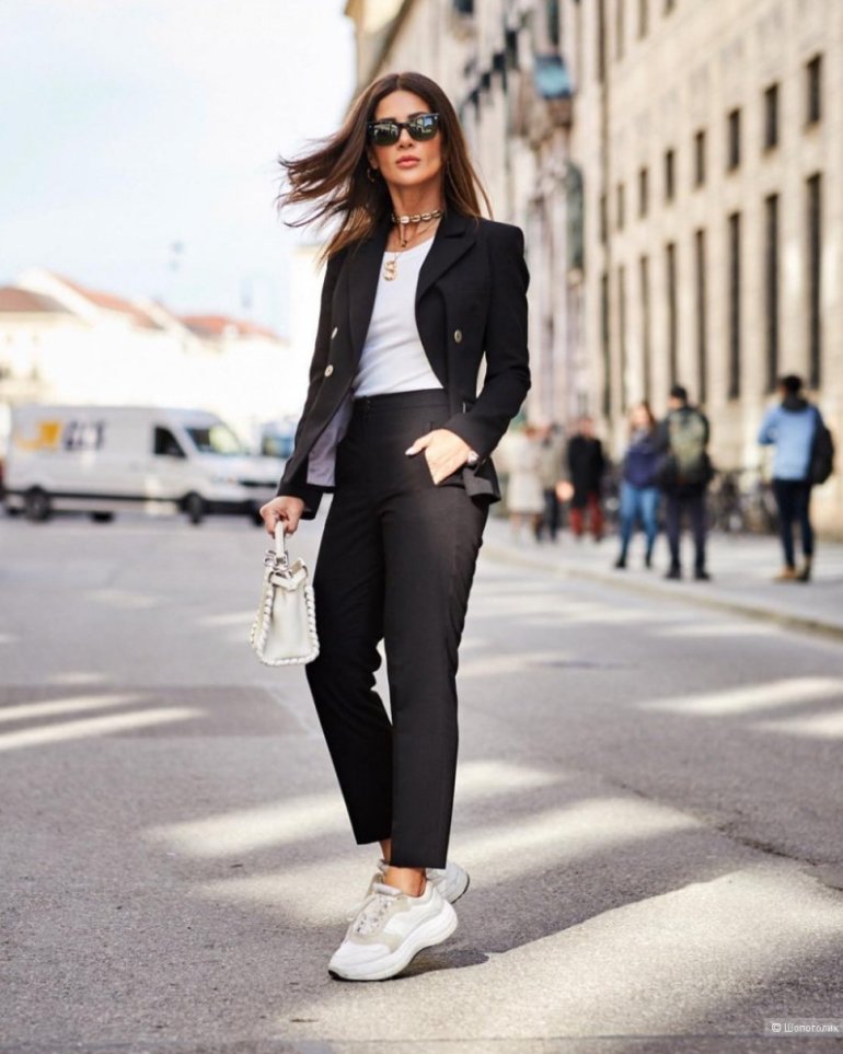 Белоснежный пиджак и темные штаны дамские.