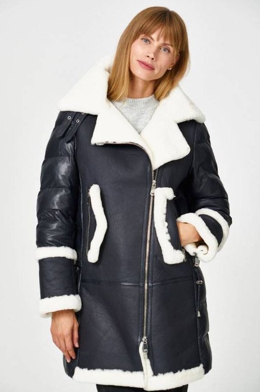 Снежная Царица утепленная кожаная куртка с отделкой овчиной.