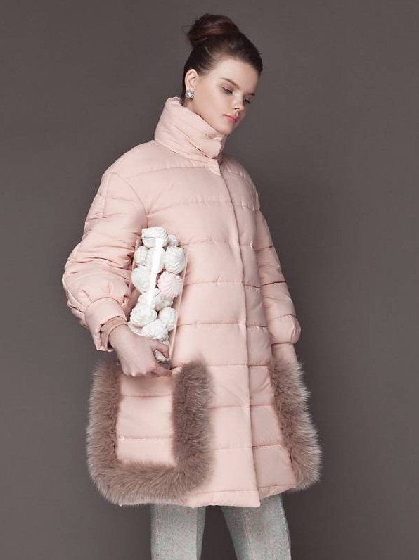 Пуховик розовый с меховыми кармашками.