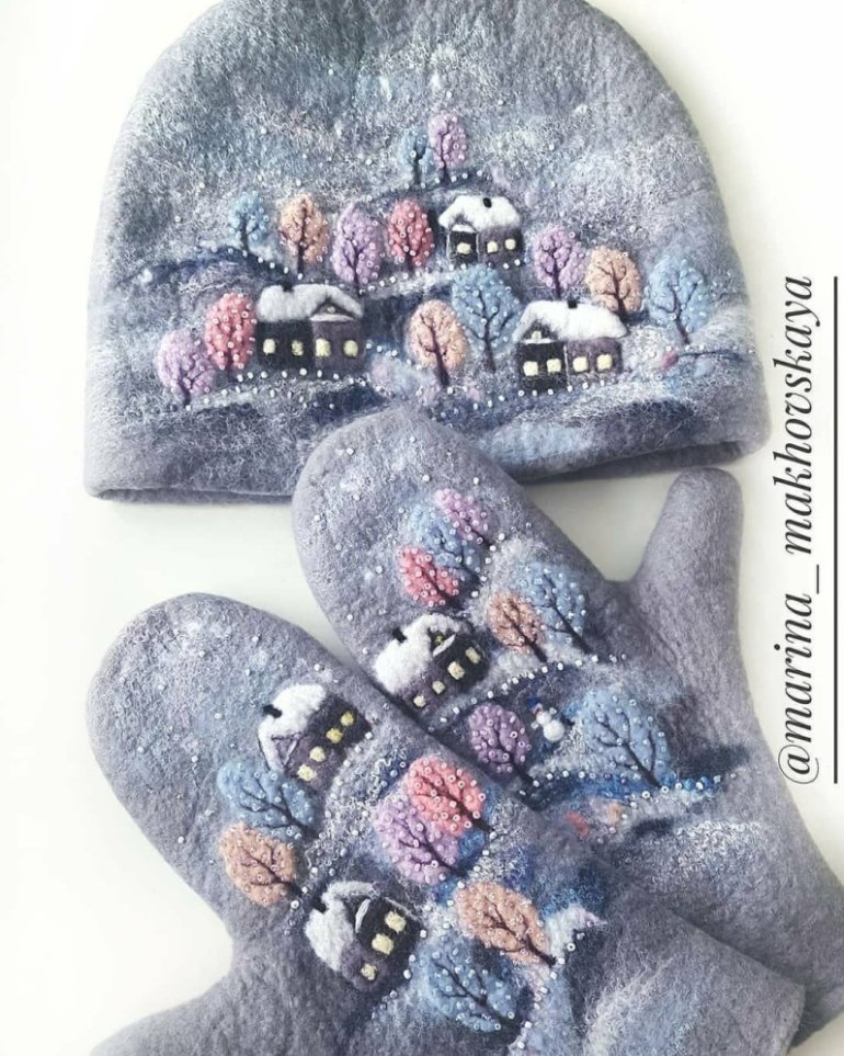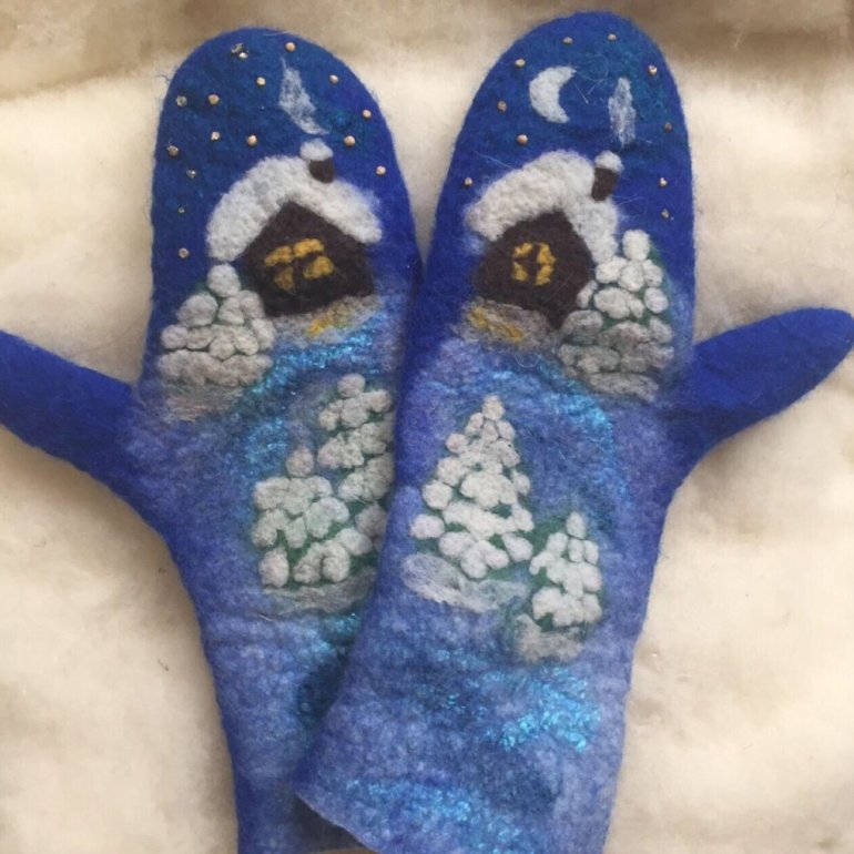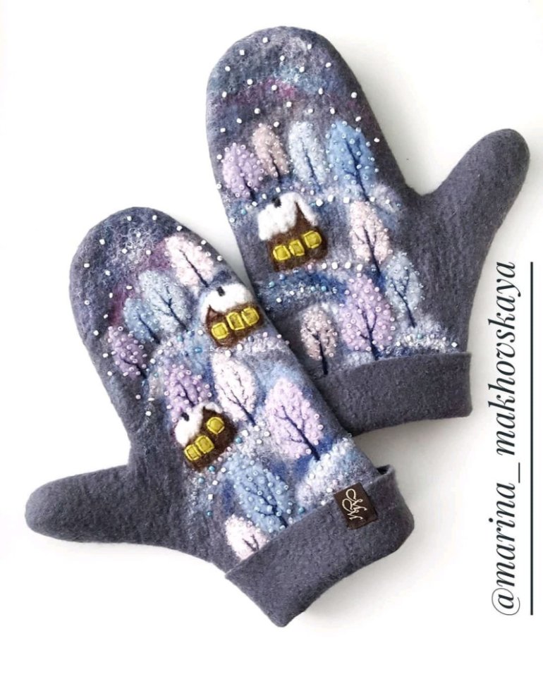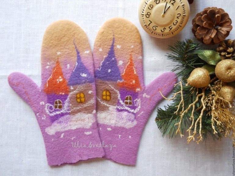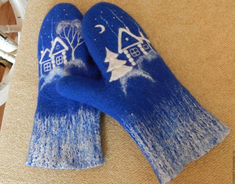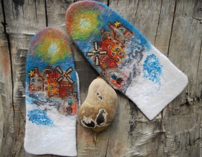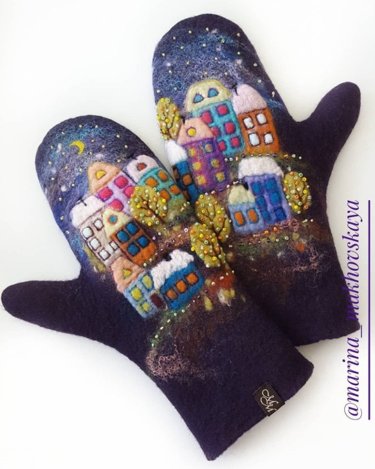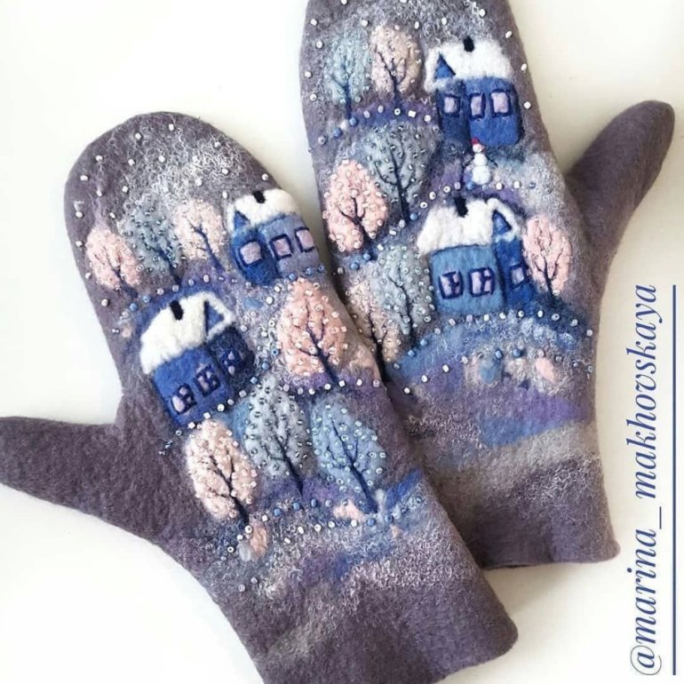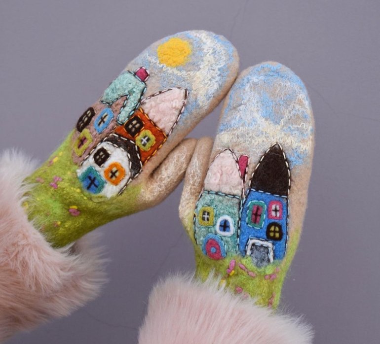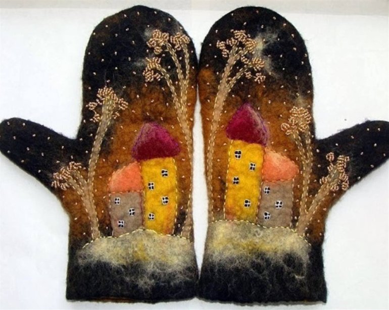 Валяные варежки с домиками.