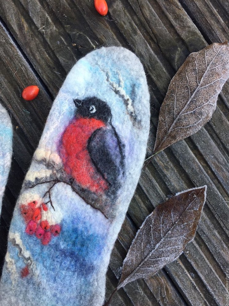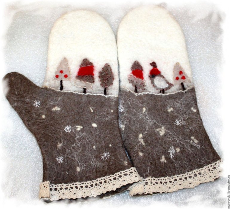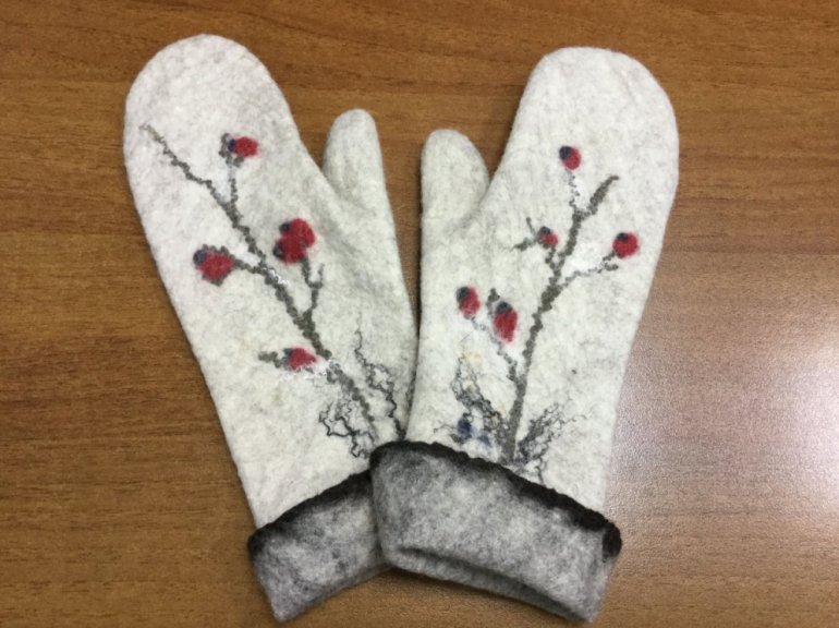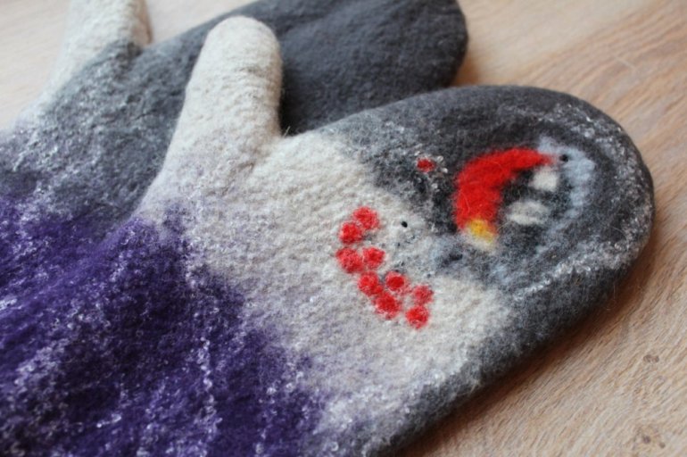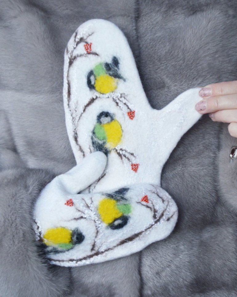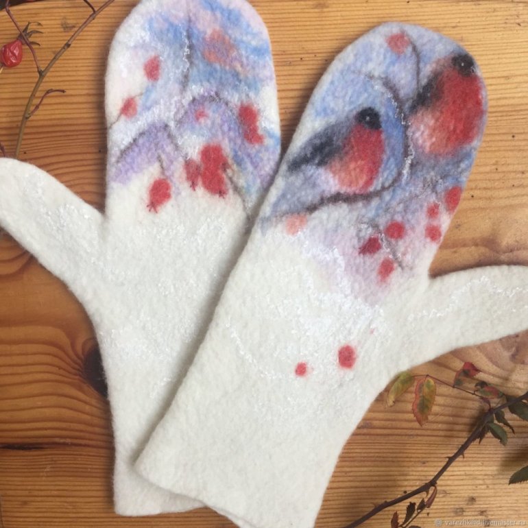 Валяные варежки со снегирями.