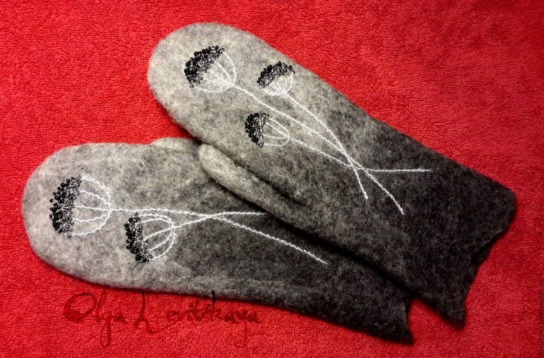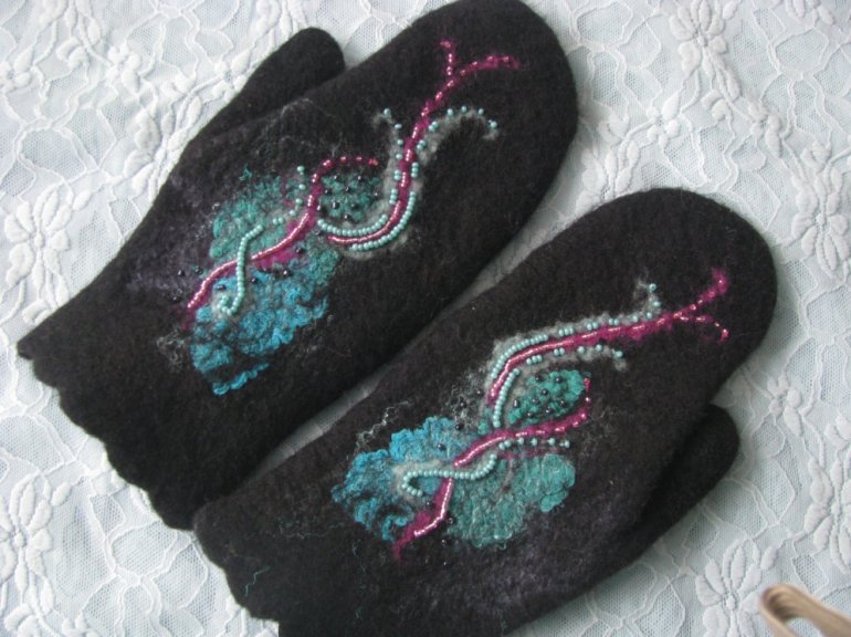 Валяные варежки расшиты бисером.