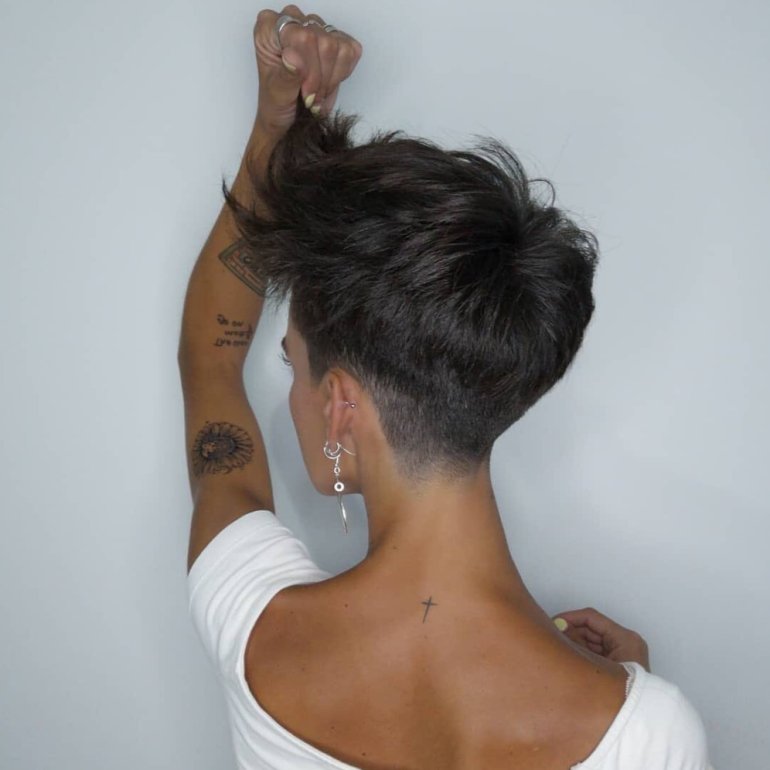 Женская стрижка Пикси брюнетка с выбритым затылком.