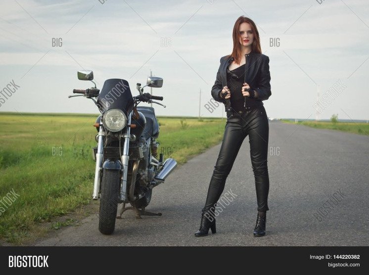Девушка в коже на байке.