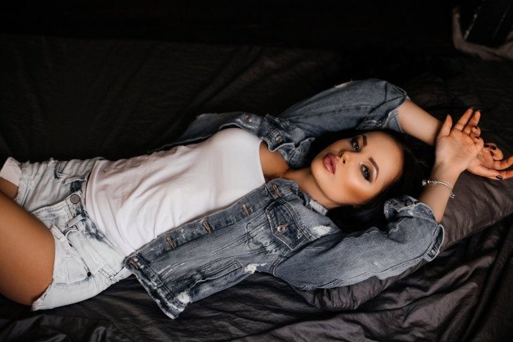 Красивая девушка в шортах лежит.