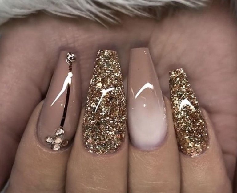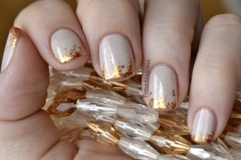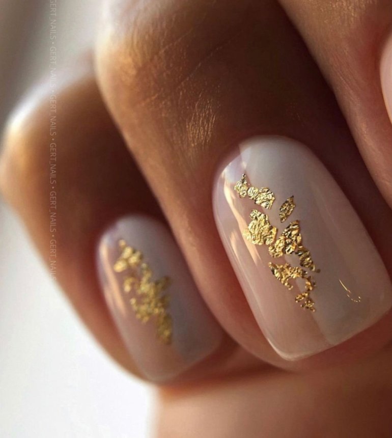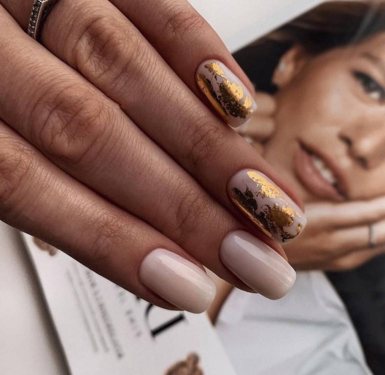 Ногти бежевые с золотом.