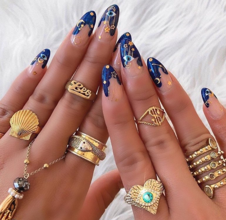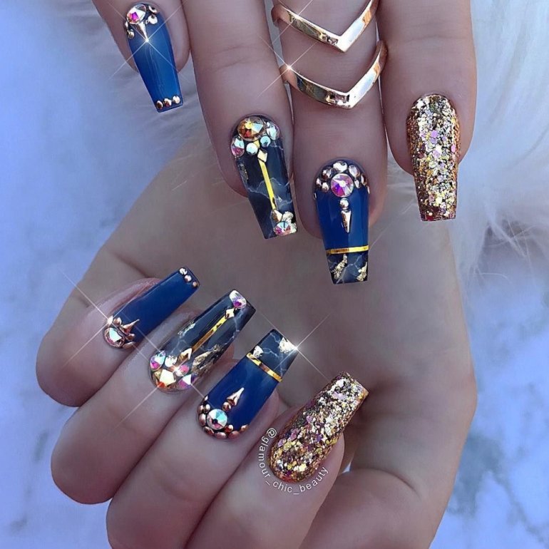 Ногти голубые с золотом.