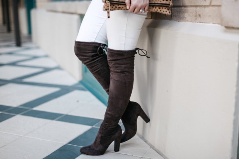 Джинсы с высочайшими сапогами.