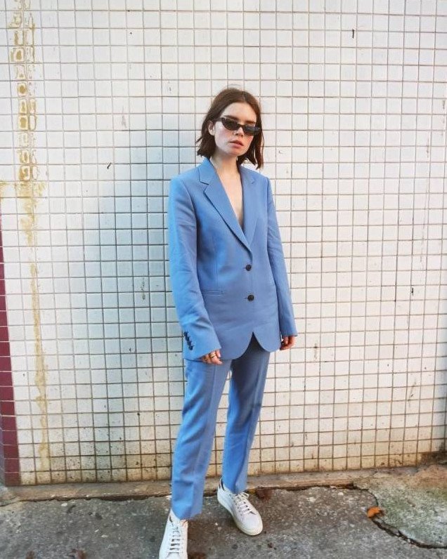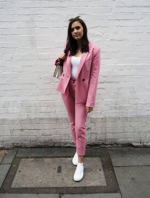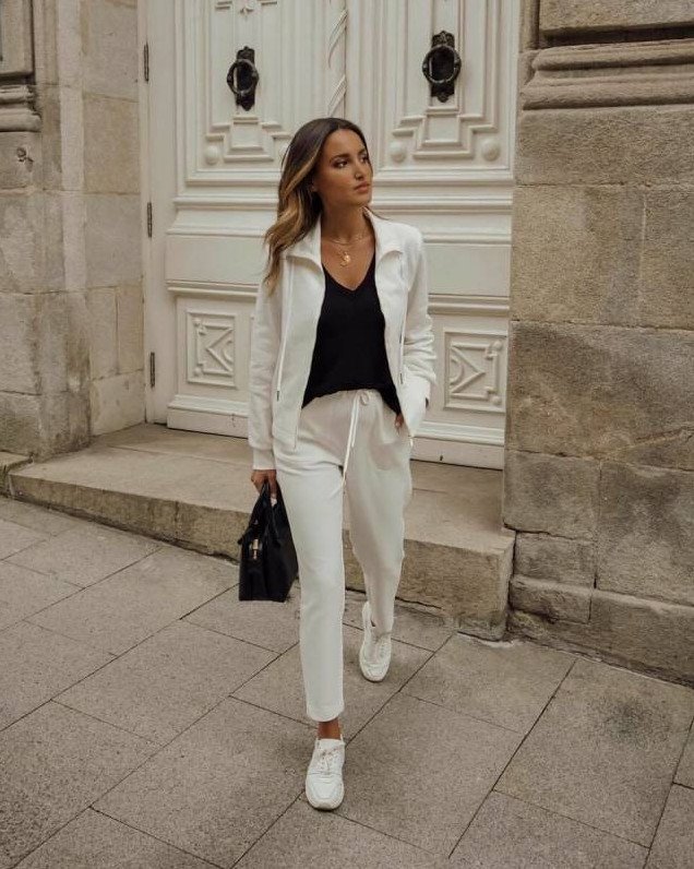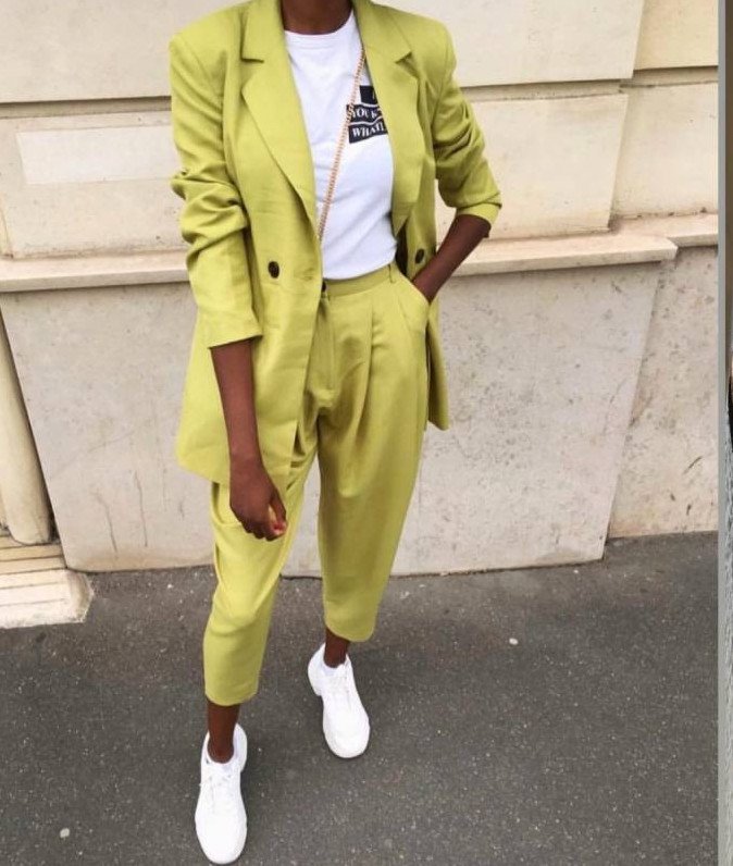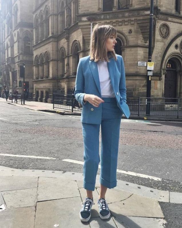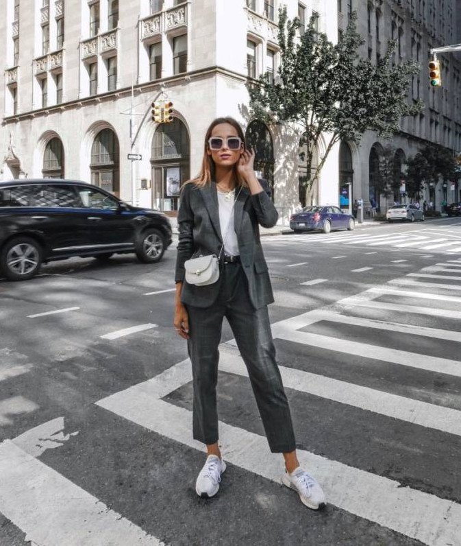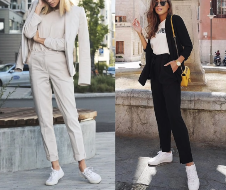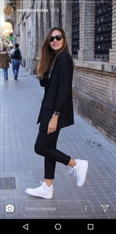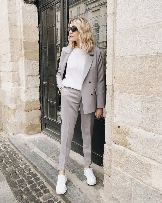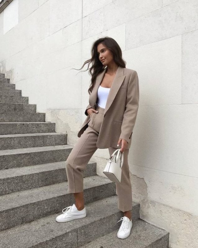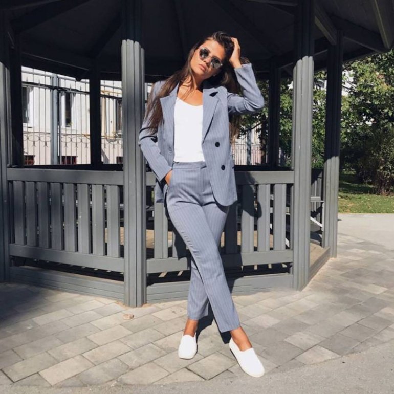 Брючный костюмчик с белоснежными кедами.
