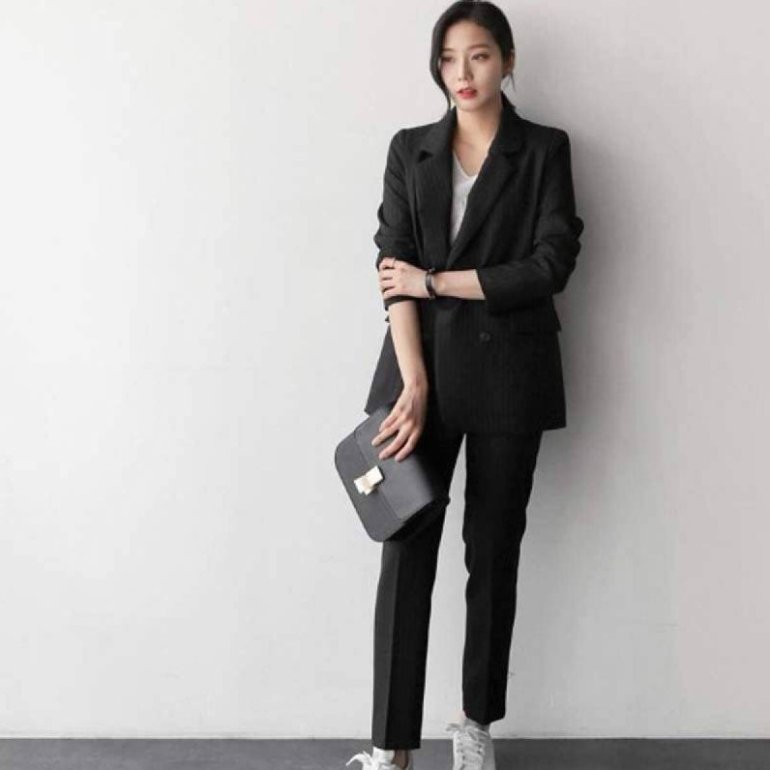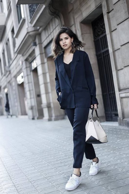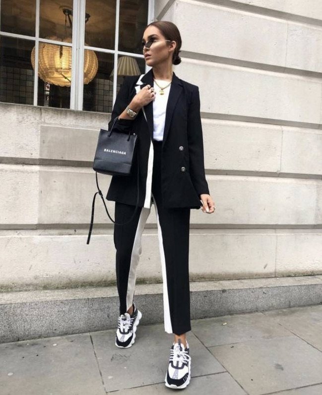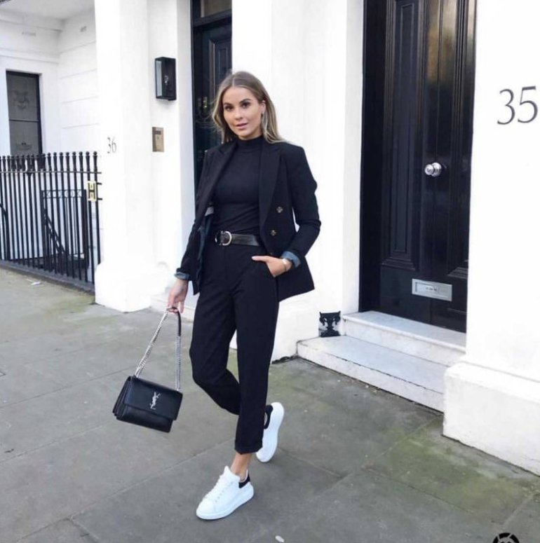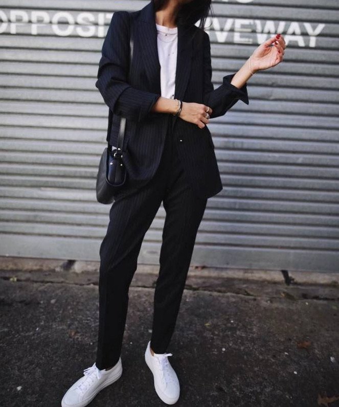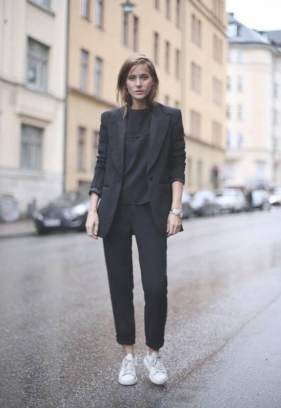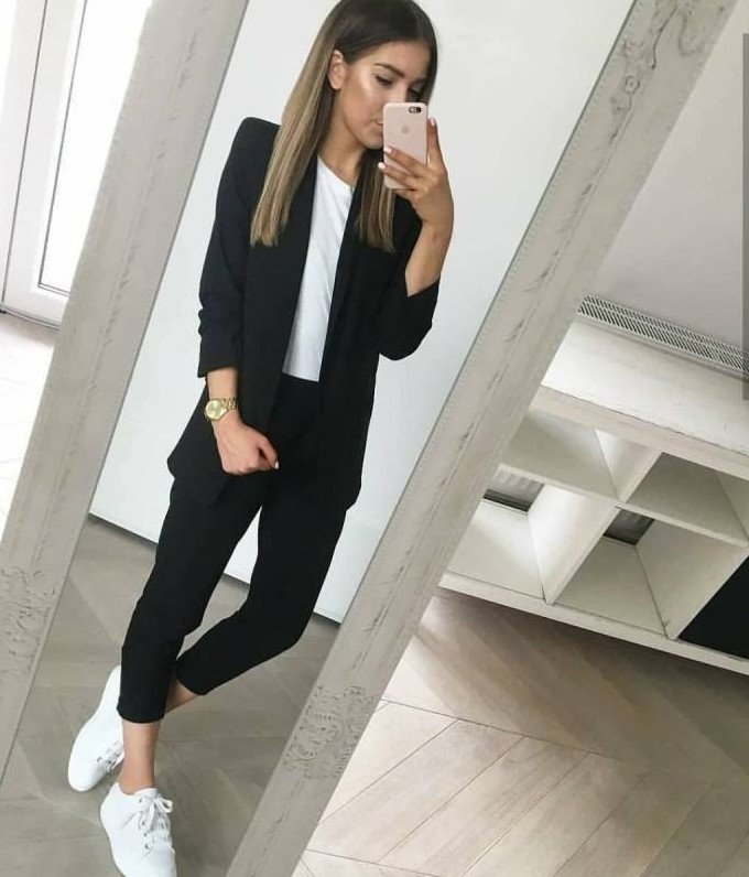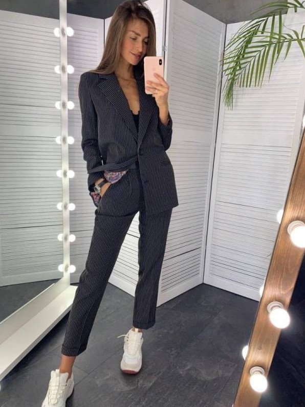 Темный брючный костюмчик дамский с кроссовками.