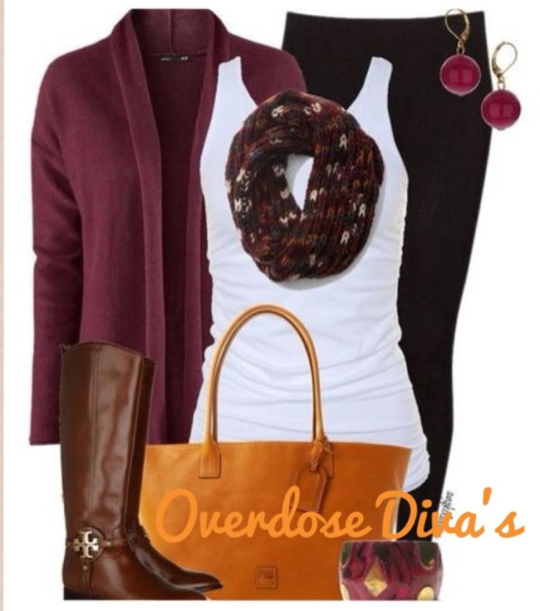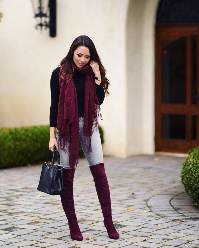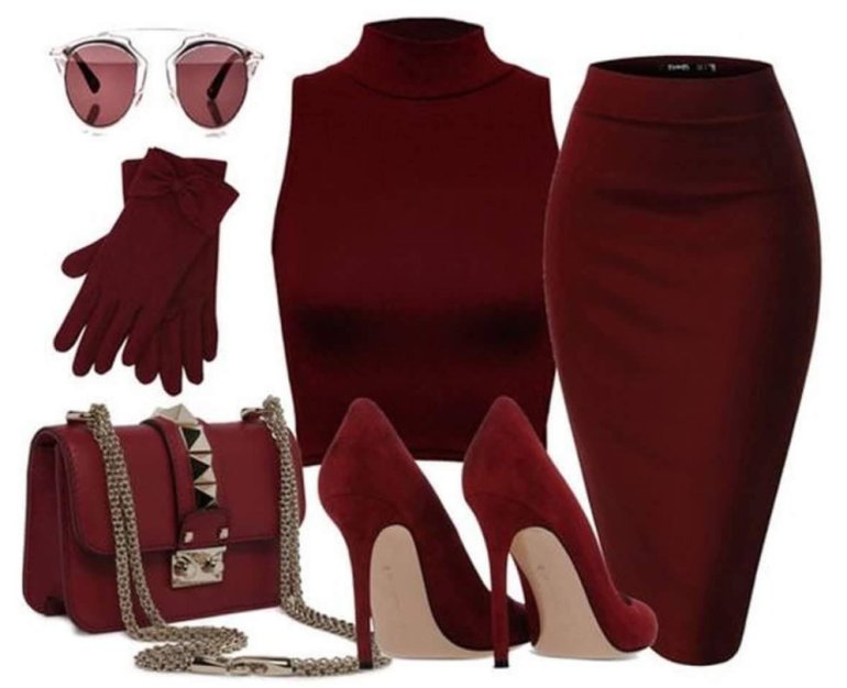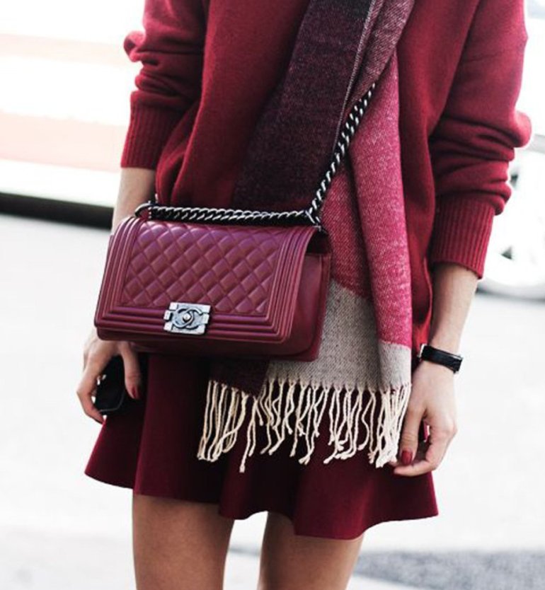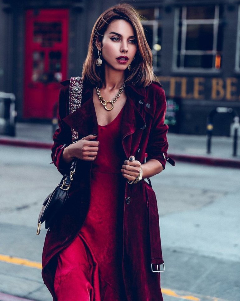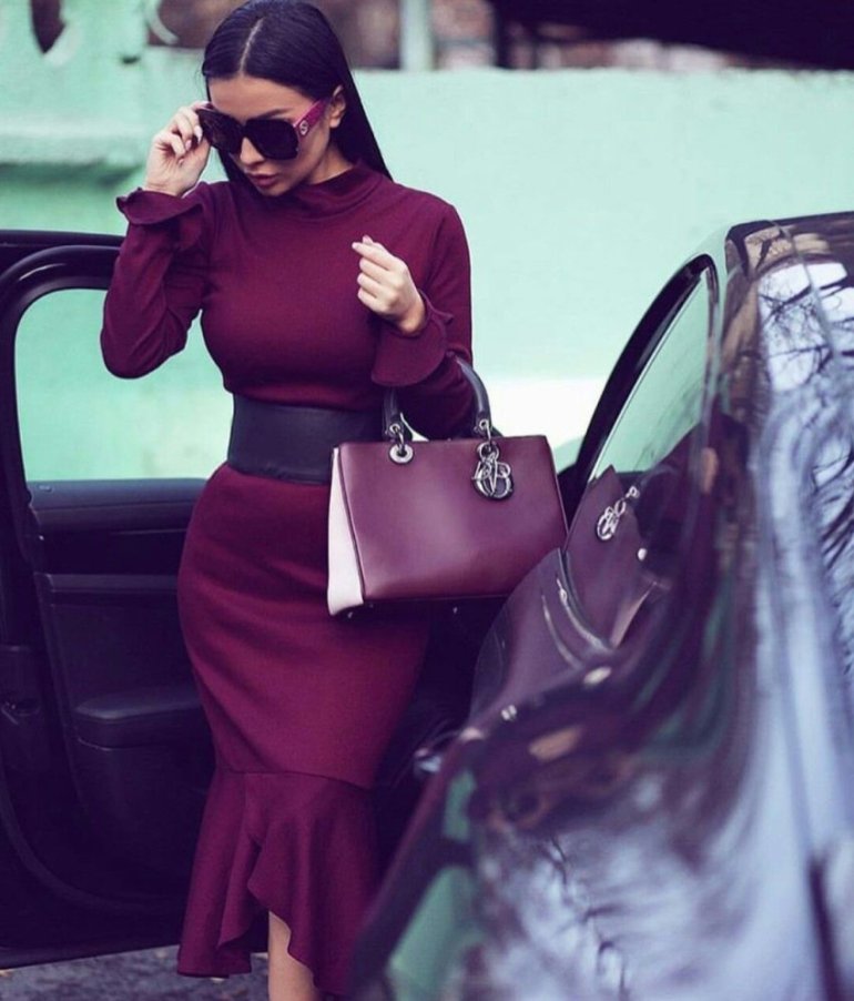 Лук с бордовым платьем.