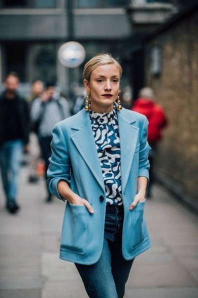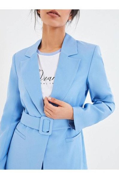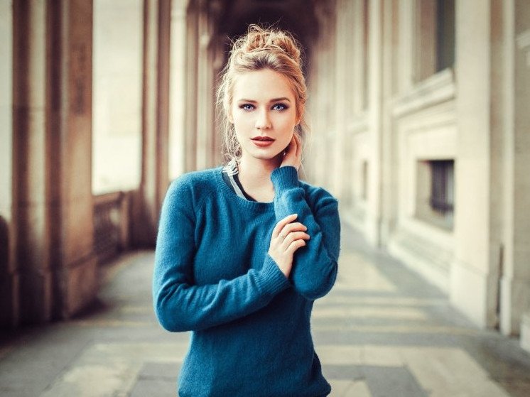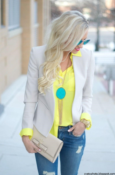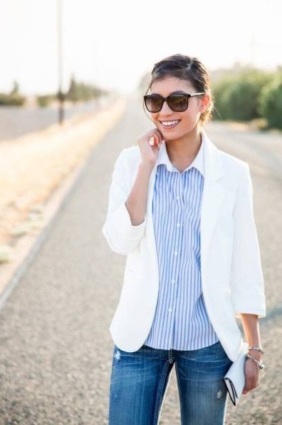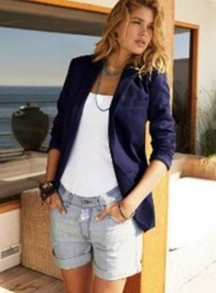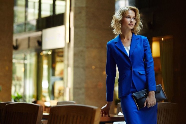 Красивая девушка в белом пиджаке посиживает в кафе.