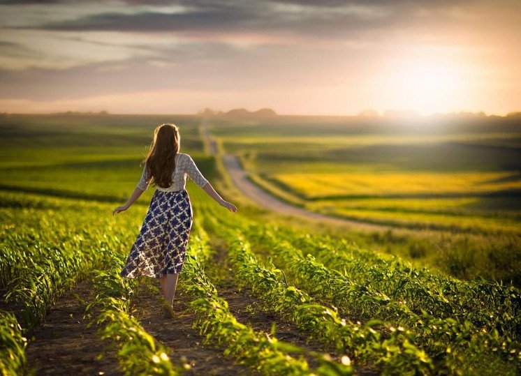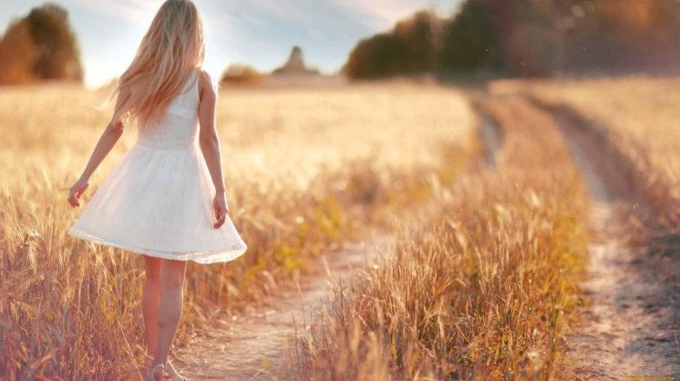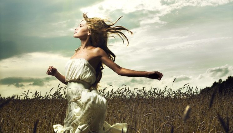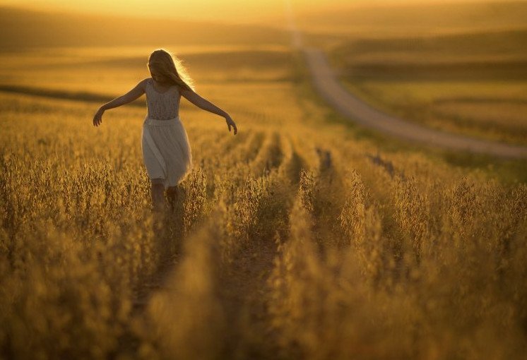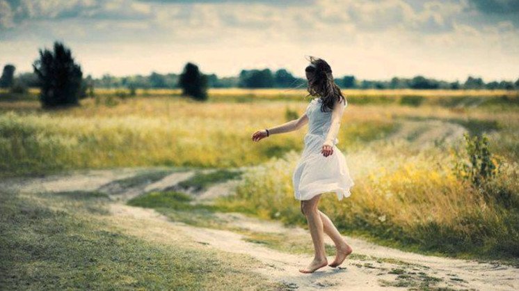 Девушка бежит в поле.