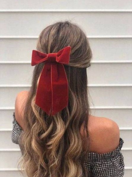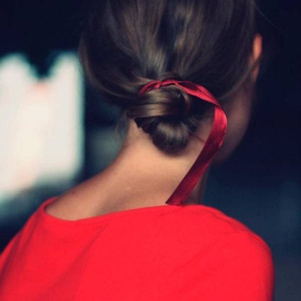Красная ленточка в волосах.