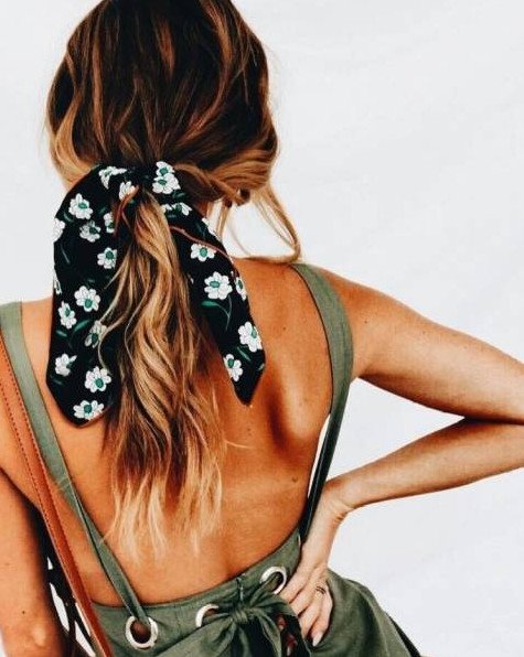 Прическа с лентой в волосах.