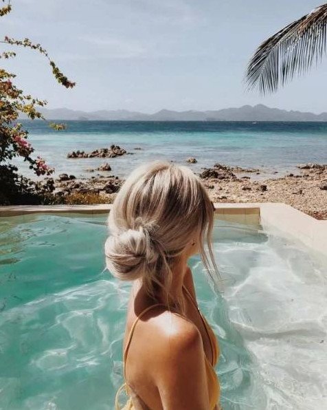 Блондиночка на море со спины.