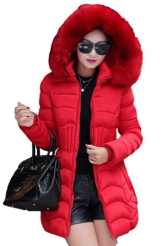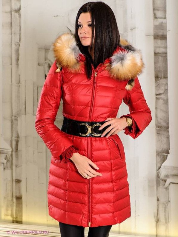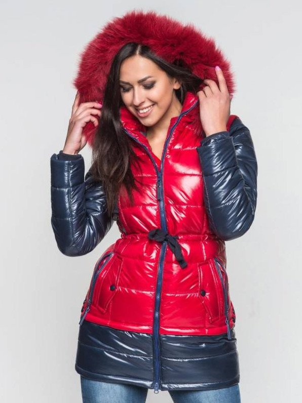 Очень красный пуховик с мехом дамский.