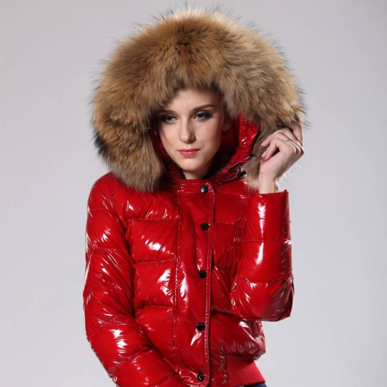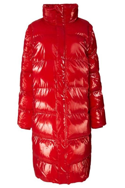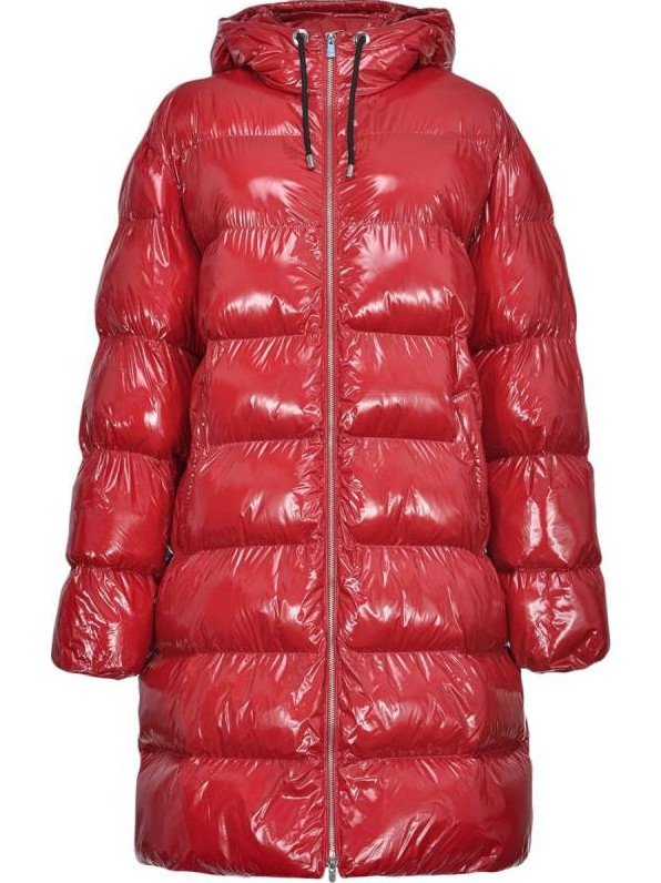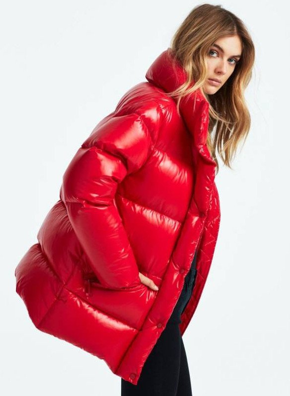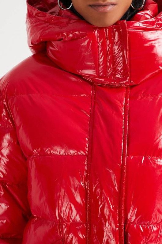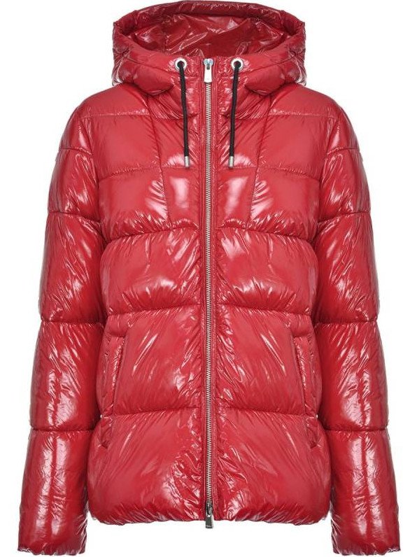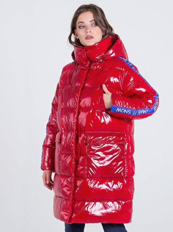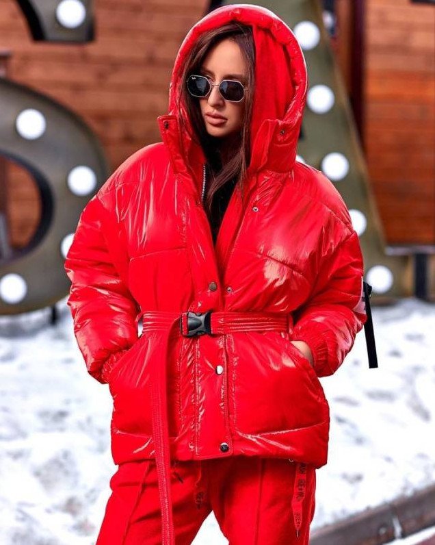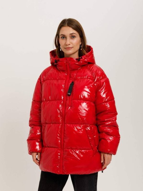 Очень красный глянцевый пуховик.