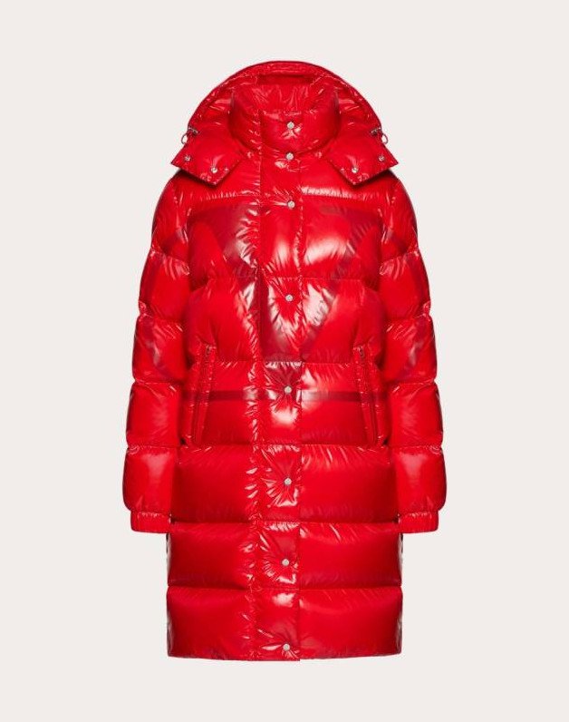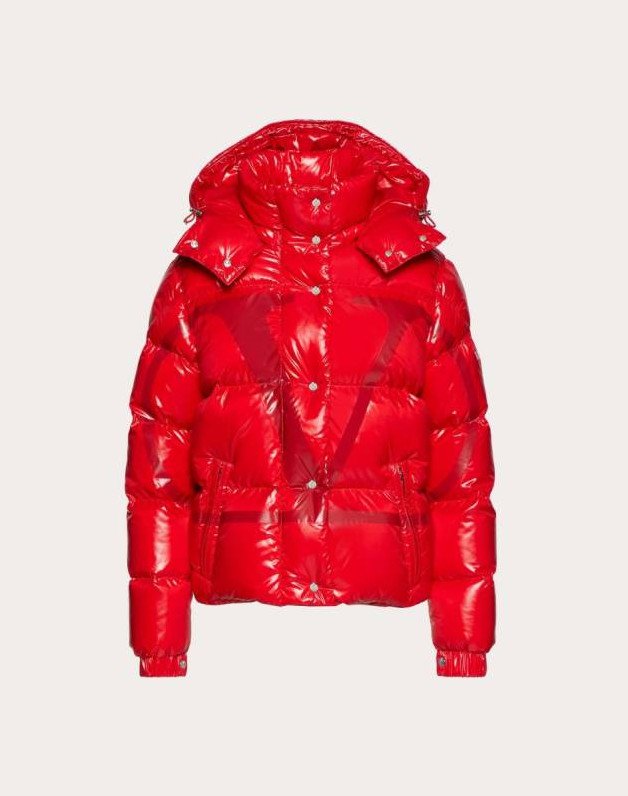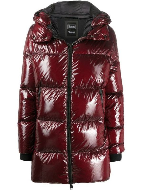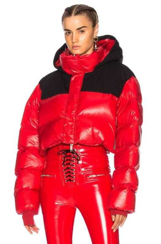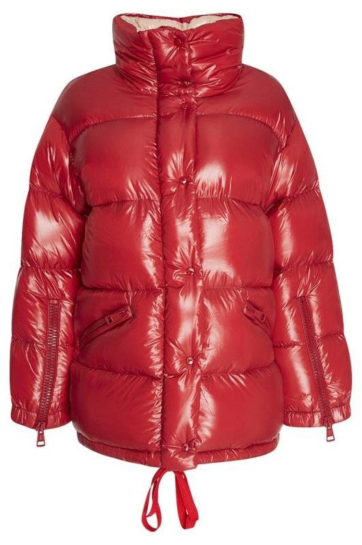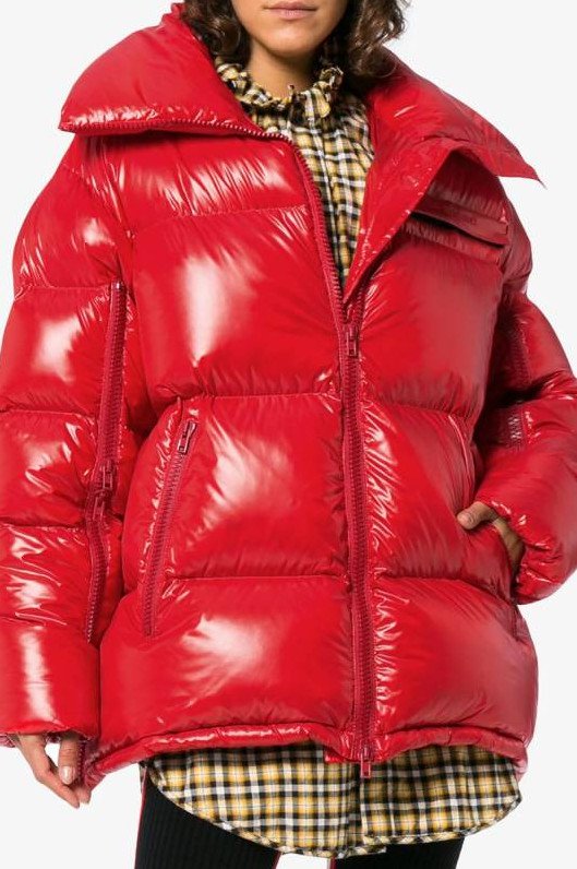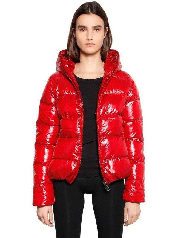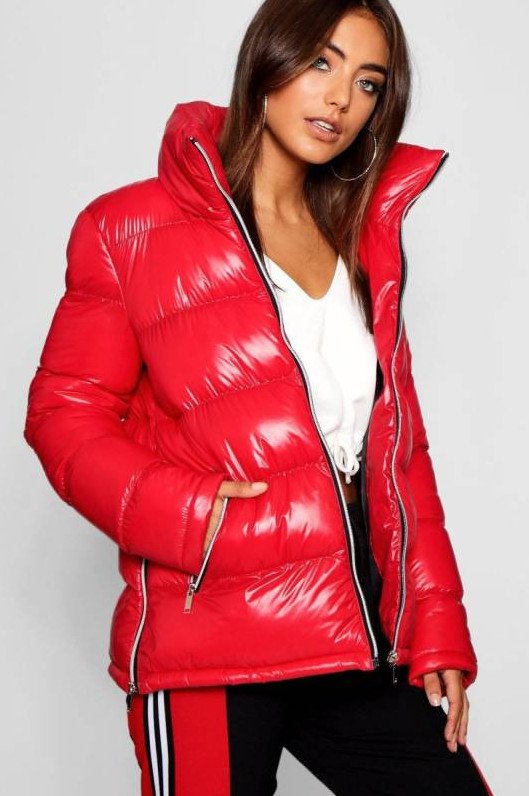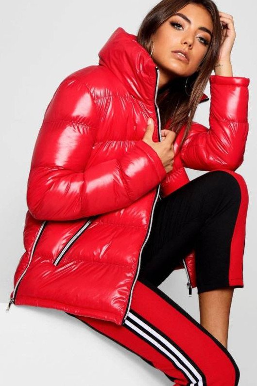 Очень красный глянцевый пуховик.